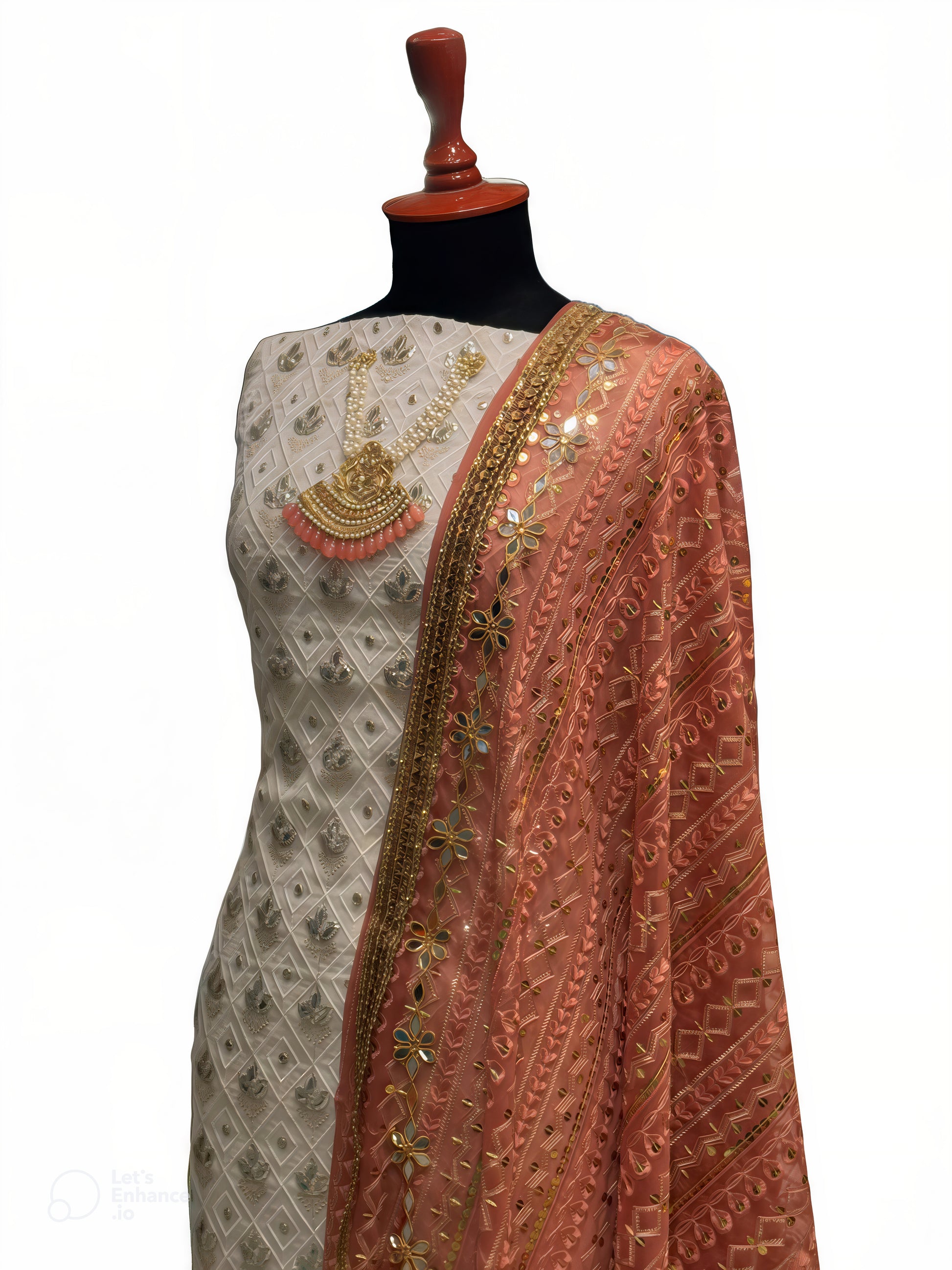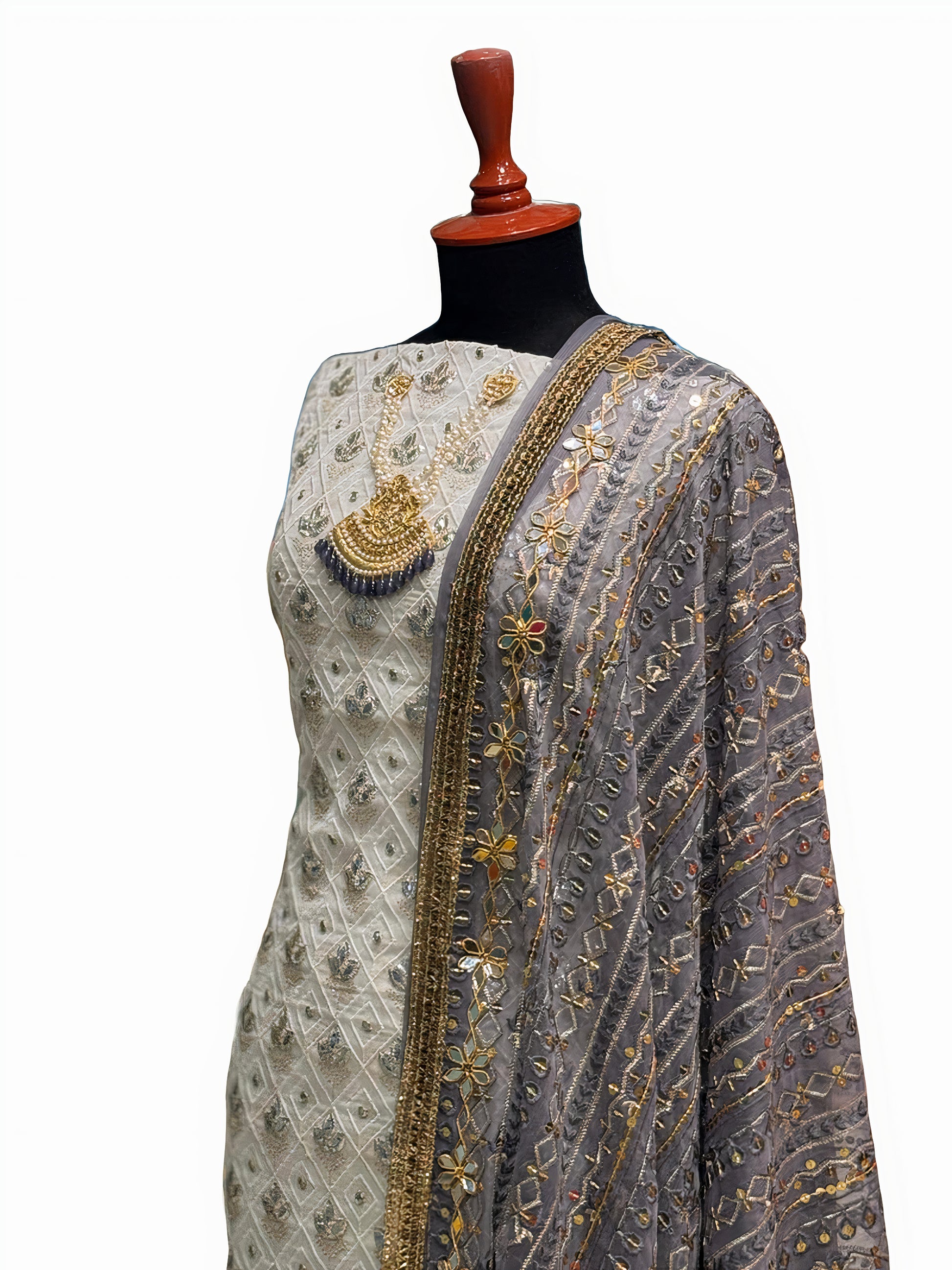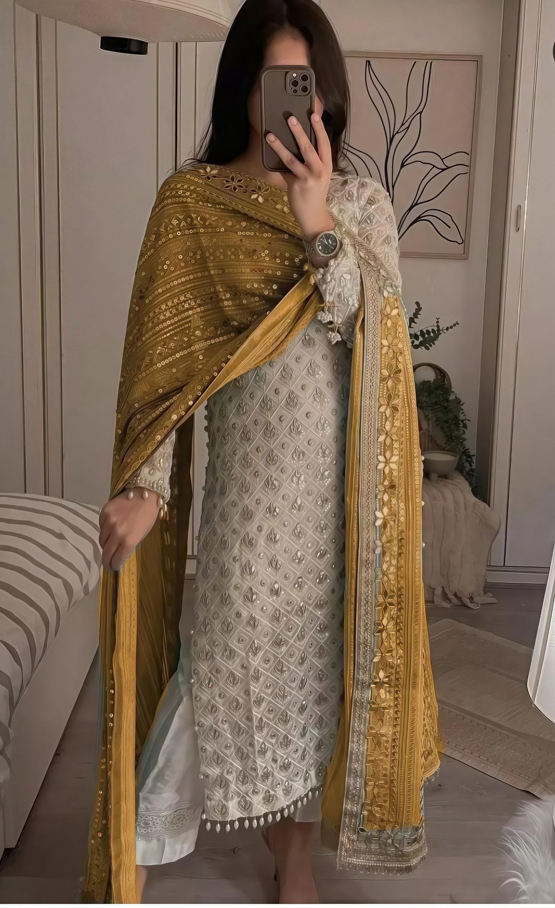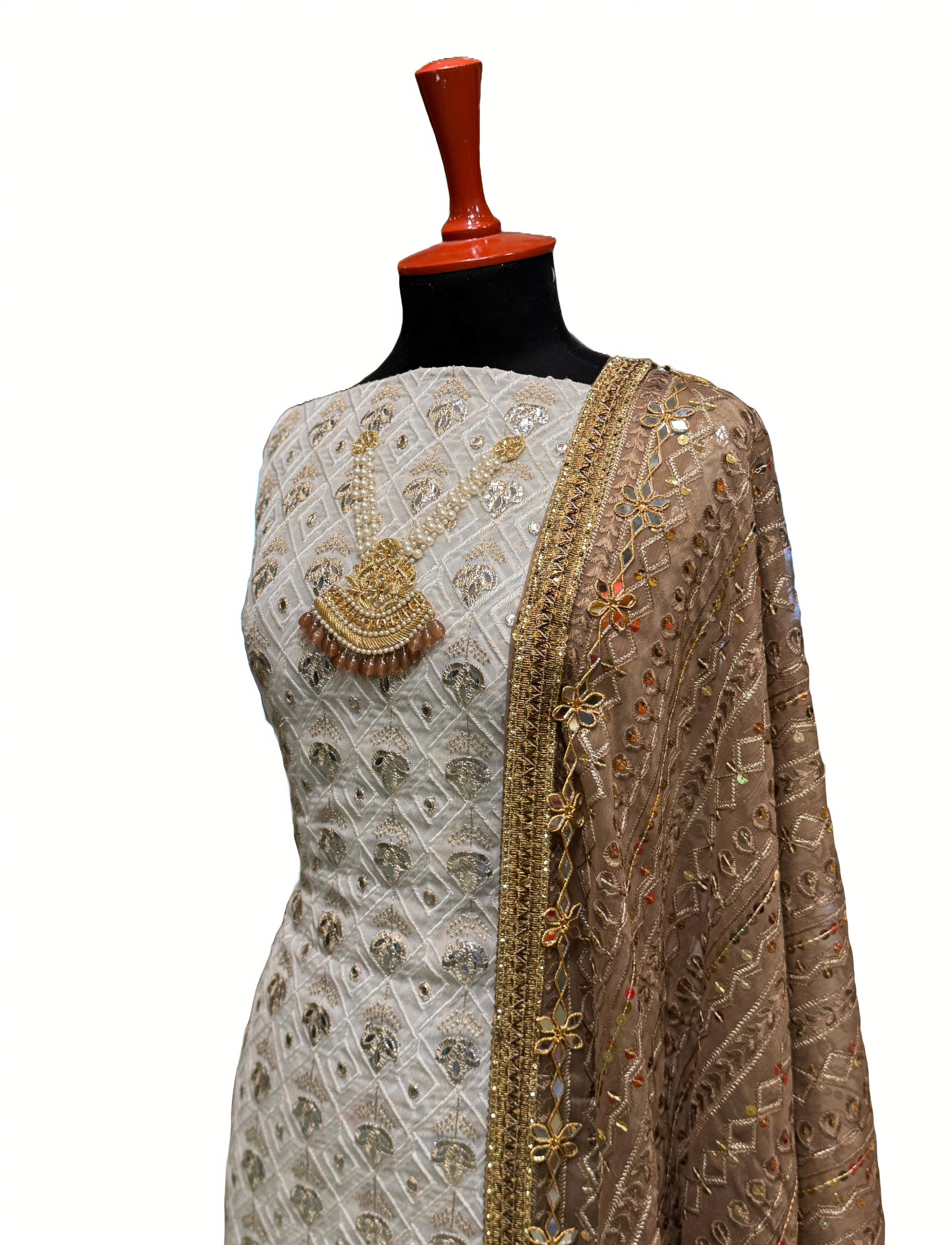 Step into timeless elegance with our beautifully crafted 3-piece chiffon suit set, designed with intricate foil work and delicate embellishments.