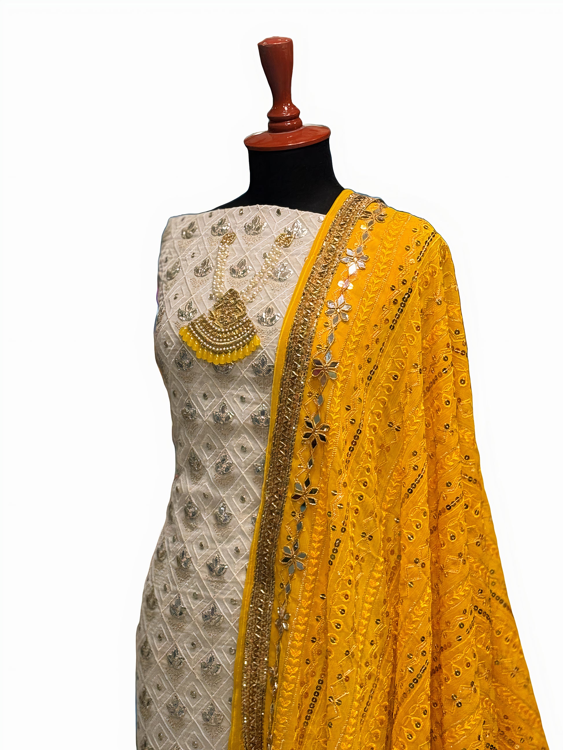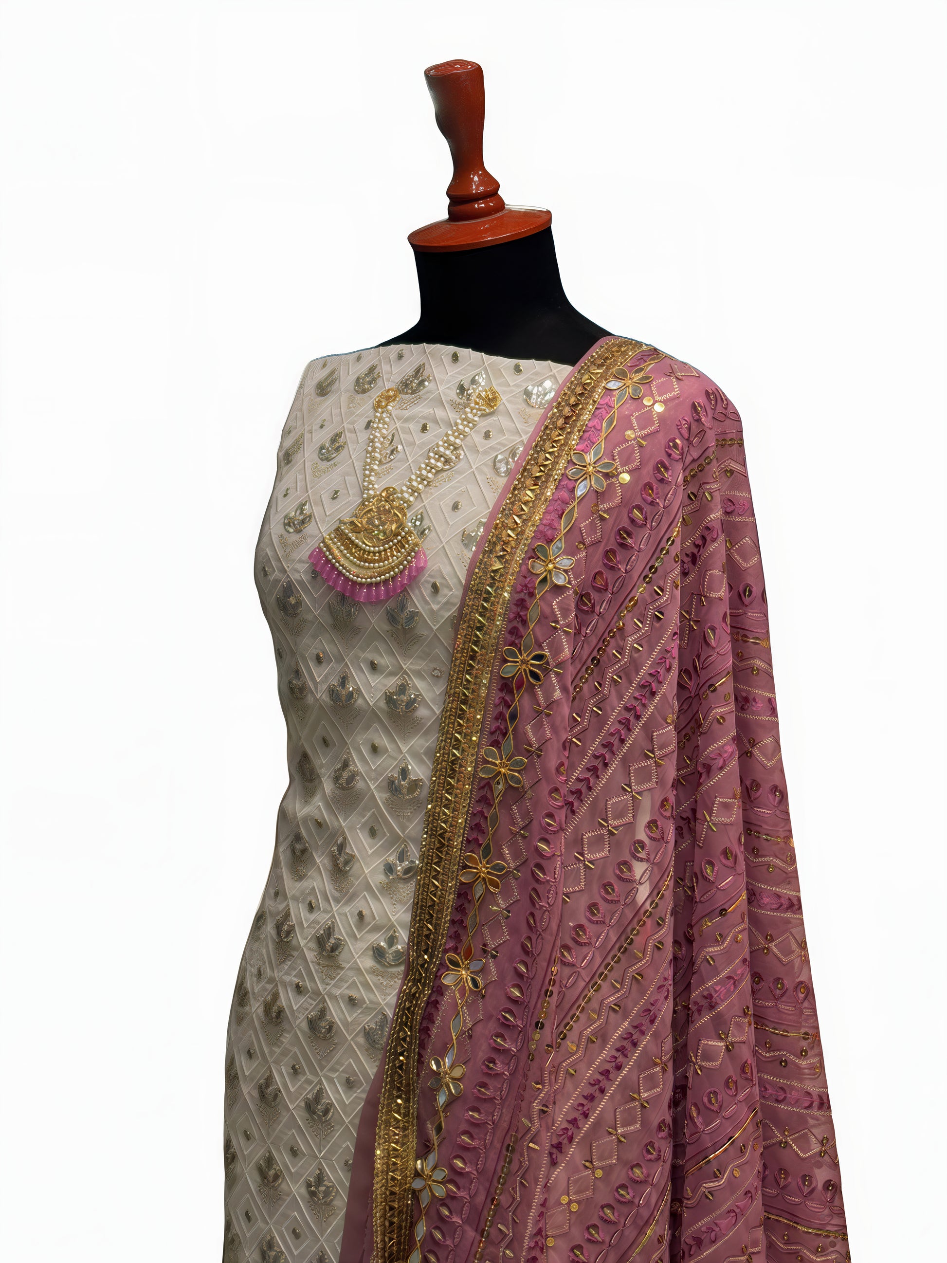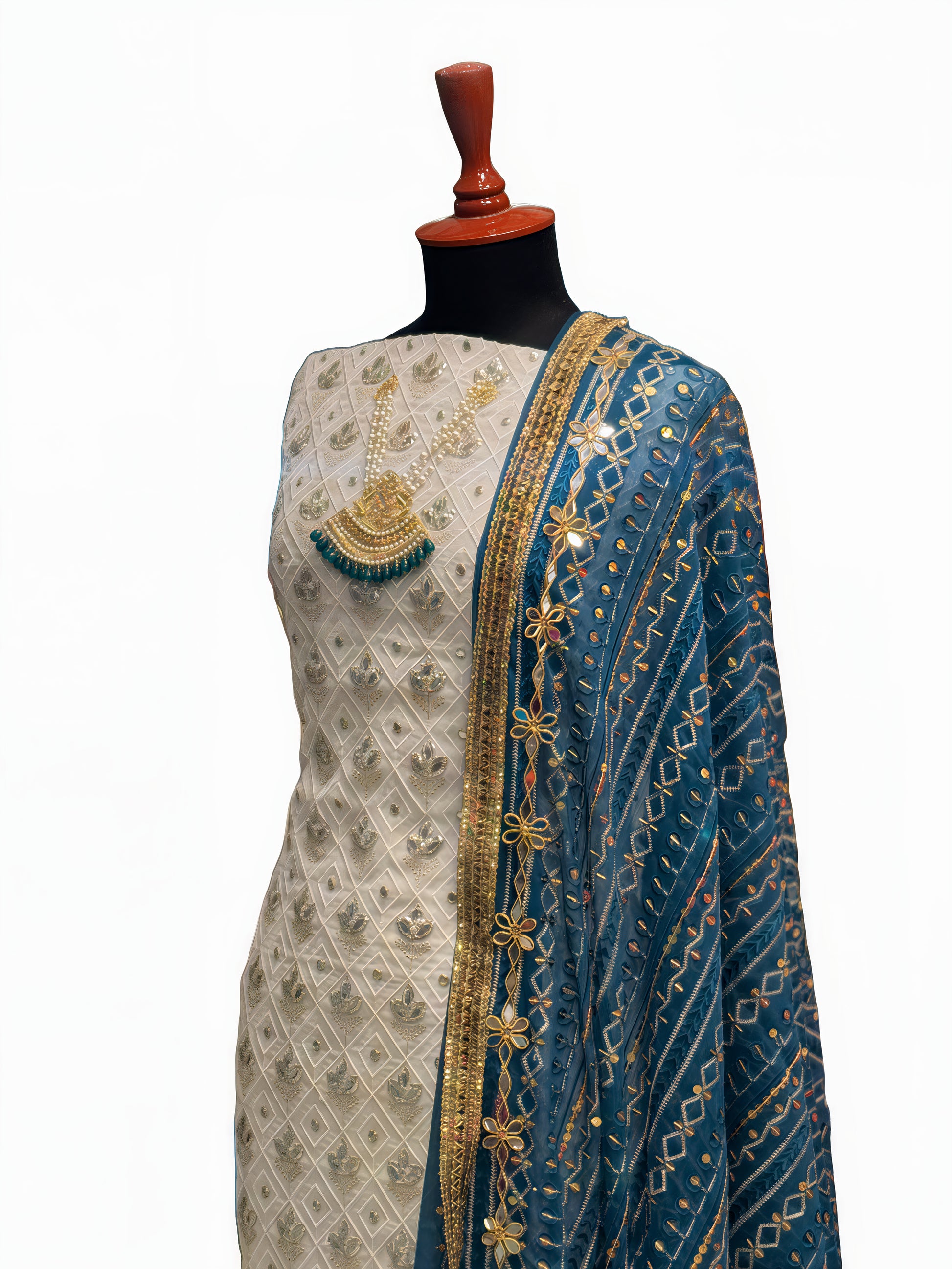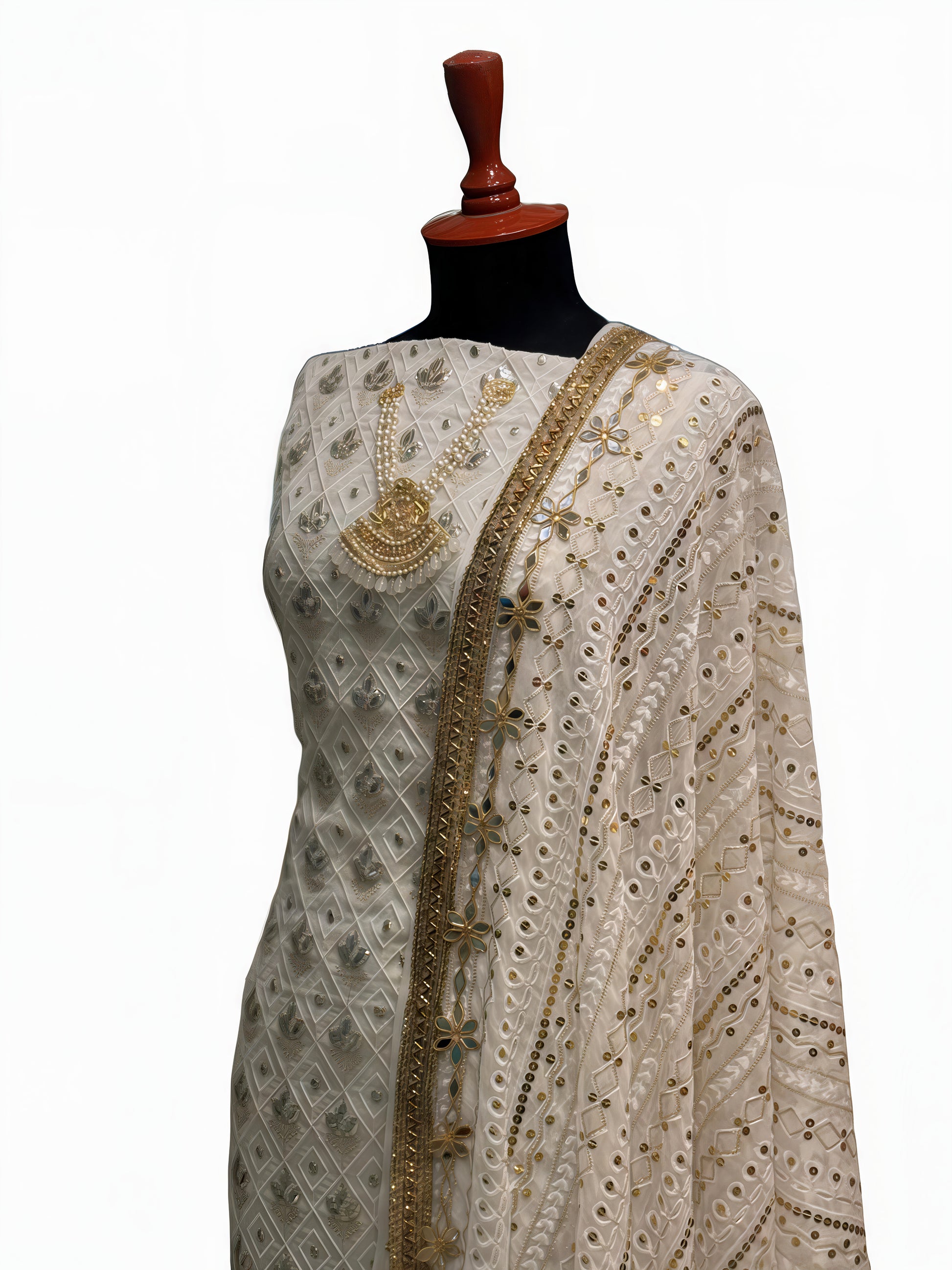 Step into timeless elegance with our beautifully crafted 3-piece chiffon suit set, designed with intricate foil work and delicate embellishments.