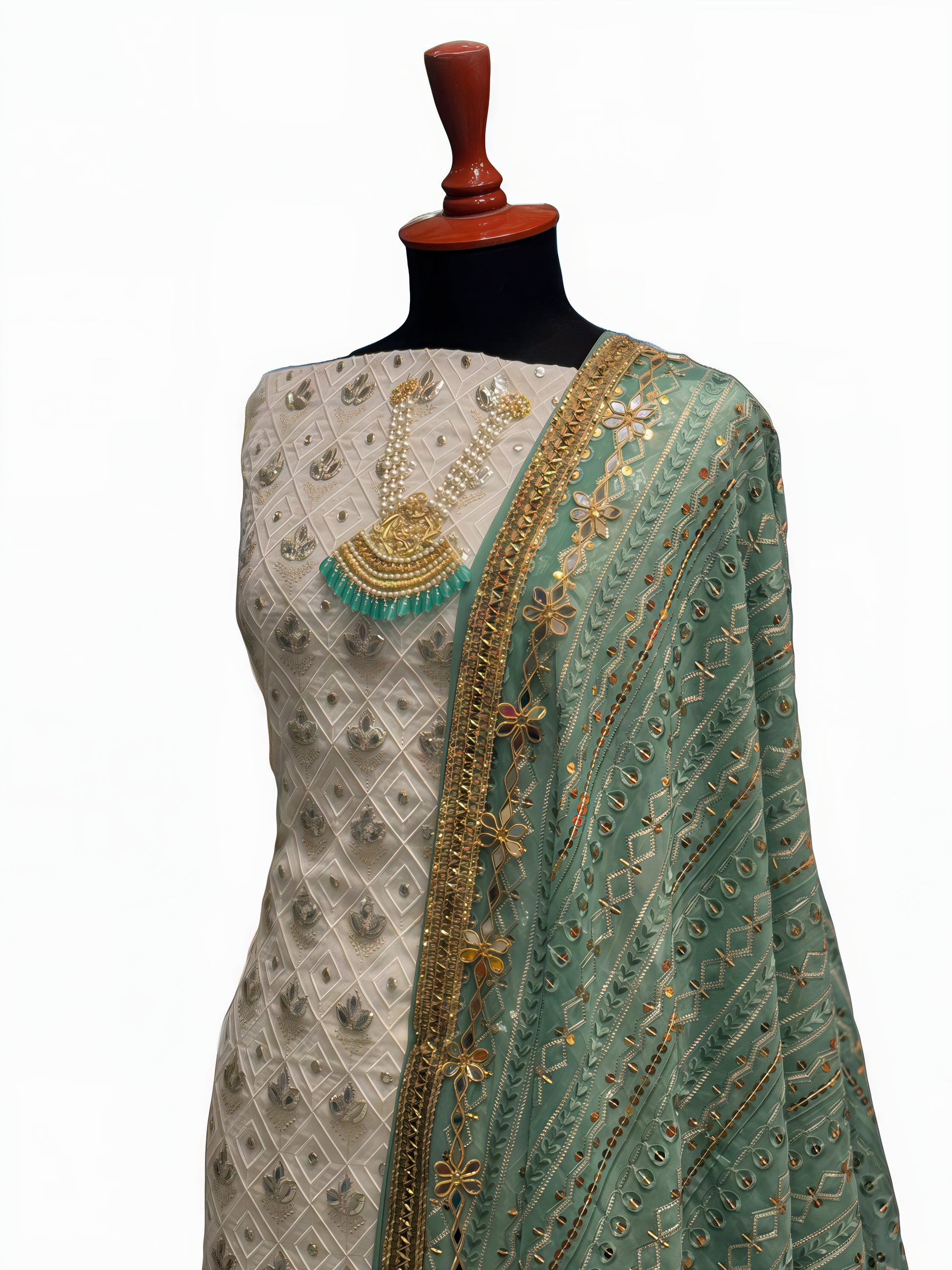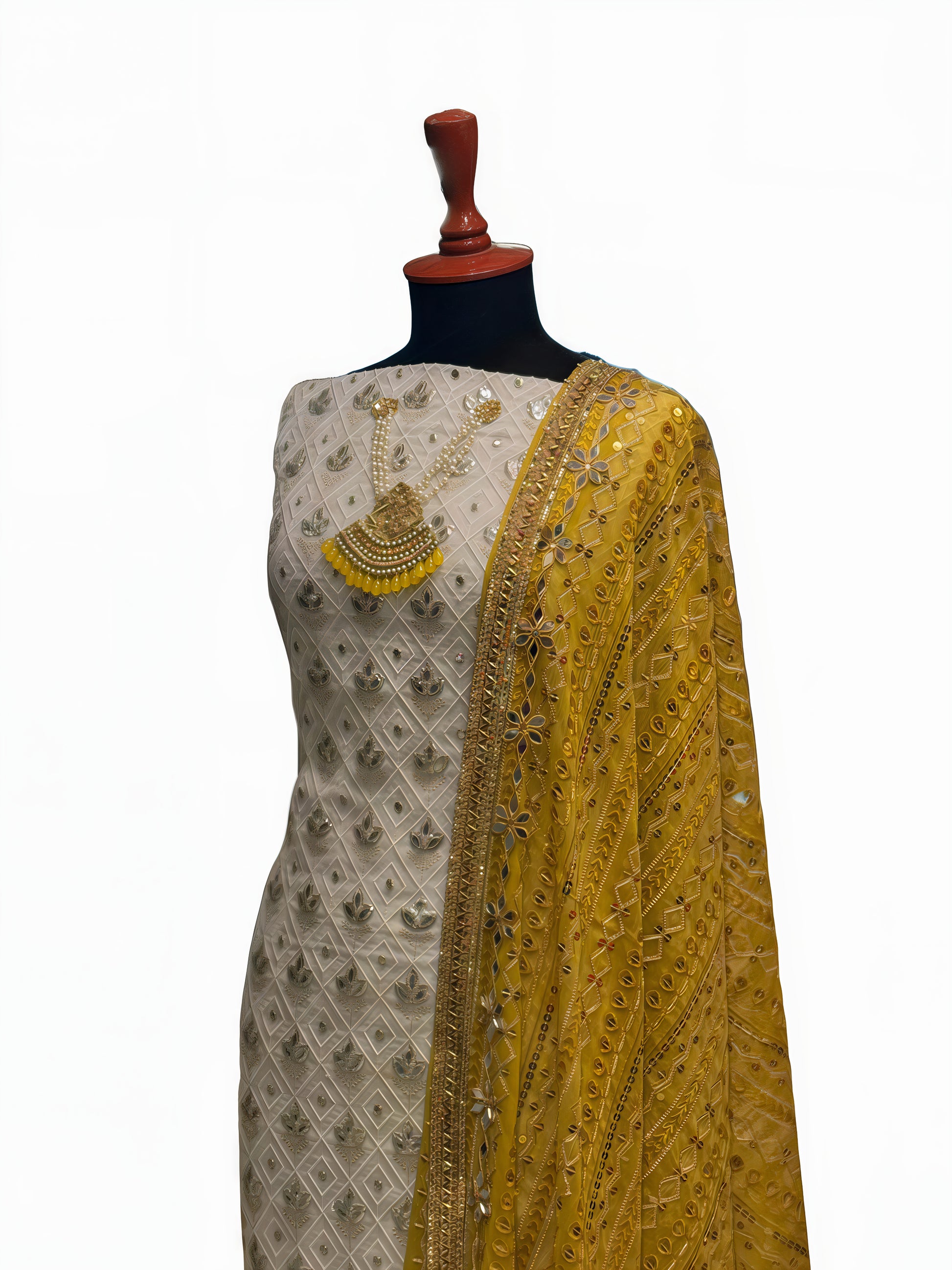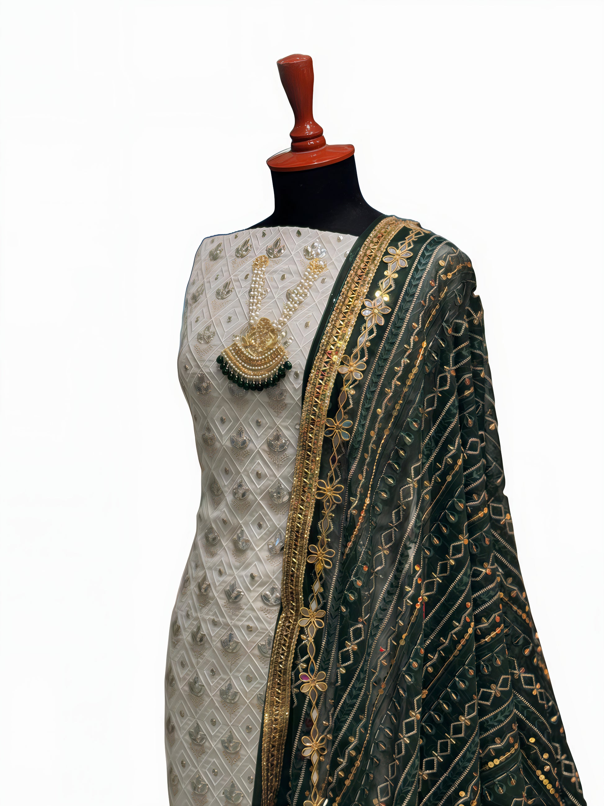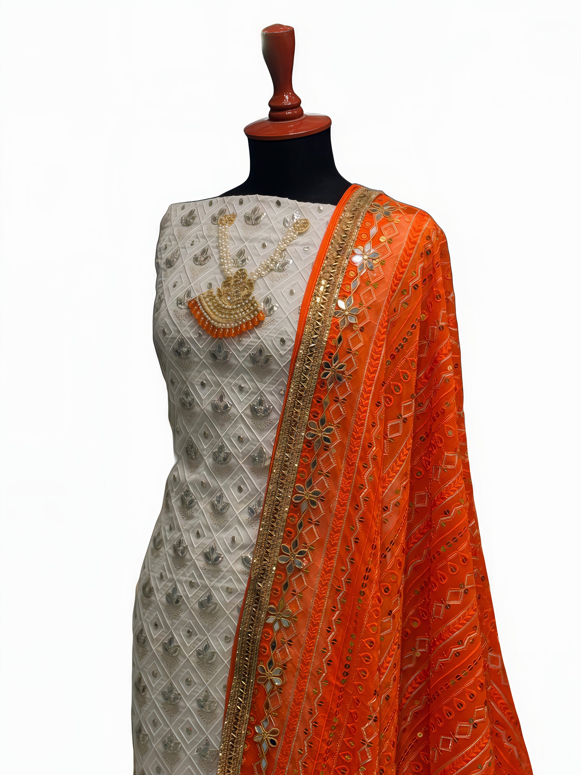 Step into timeless elegance with our beautifully crafted 3-piece chiffon suit set, designed with intricate foil work and delicate embellishments.