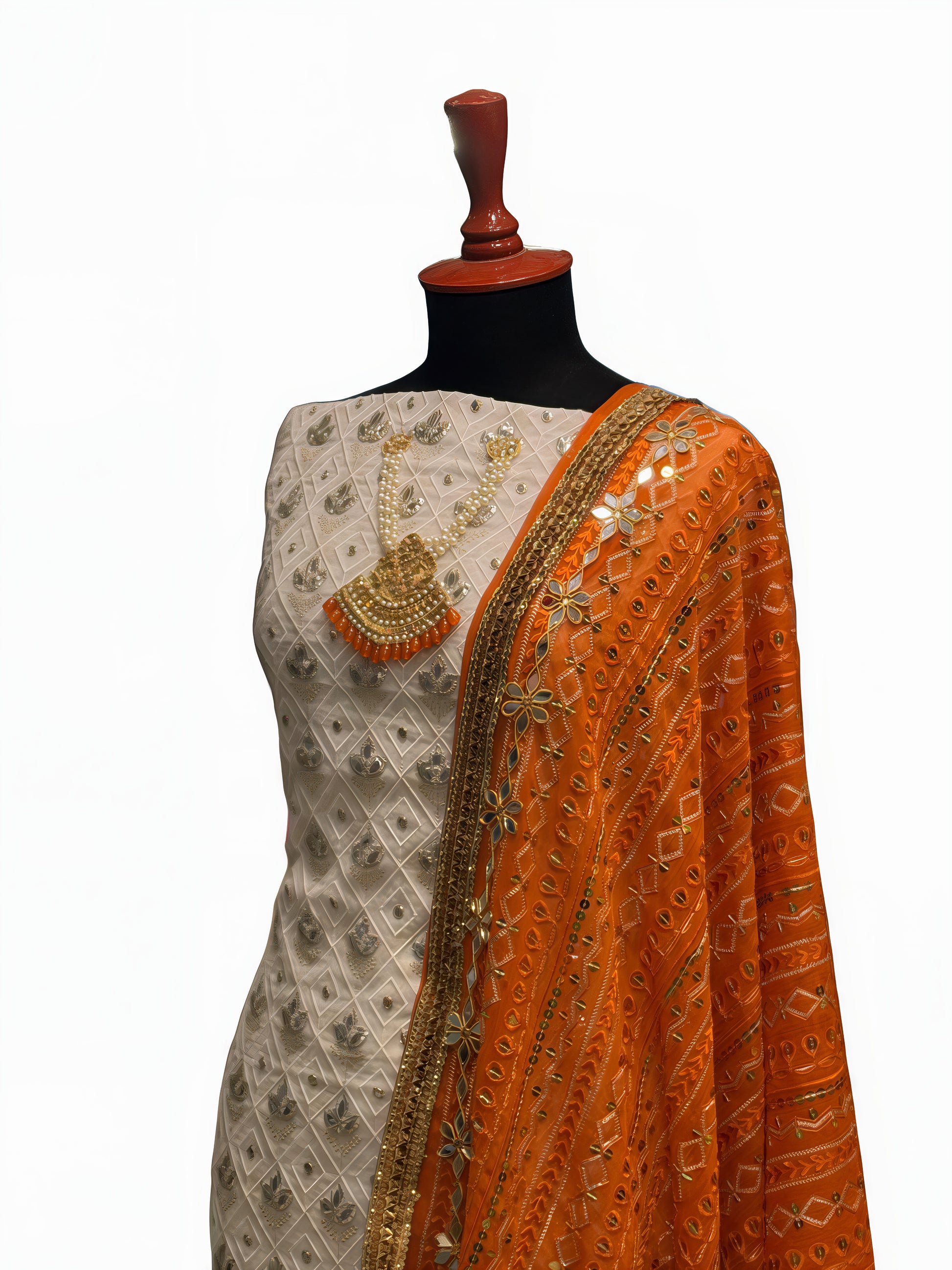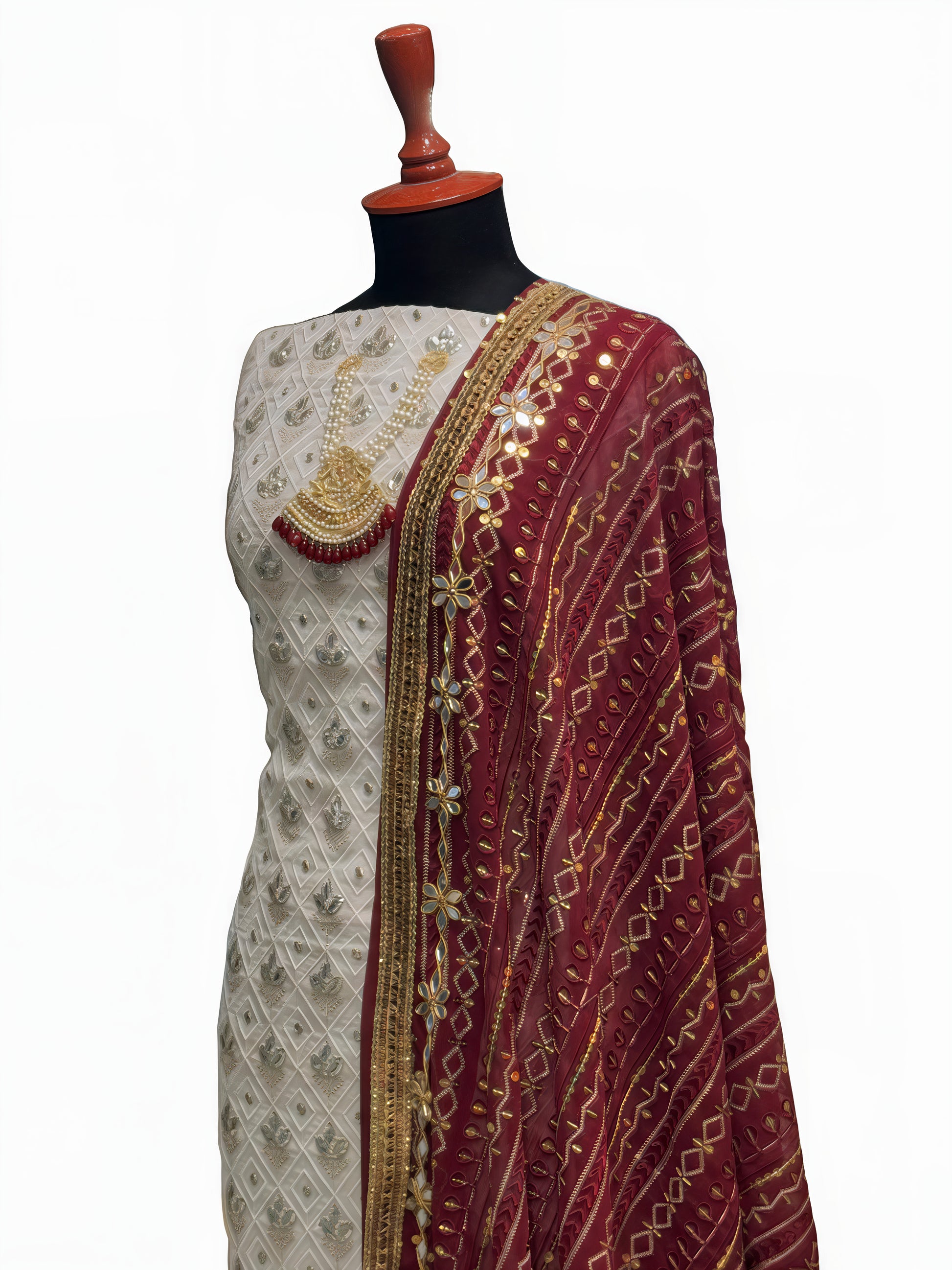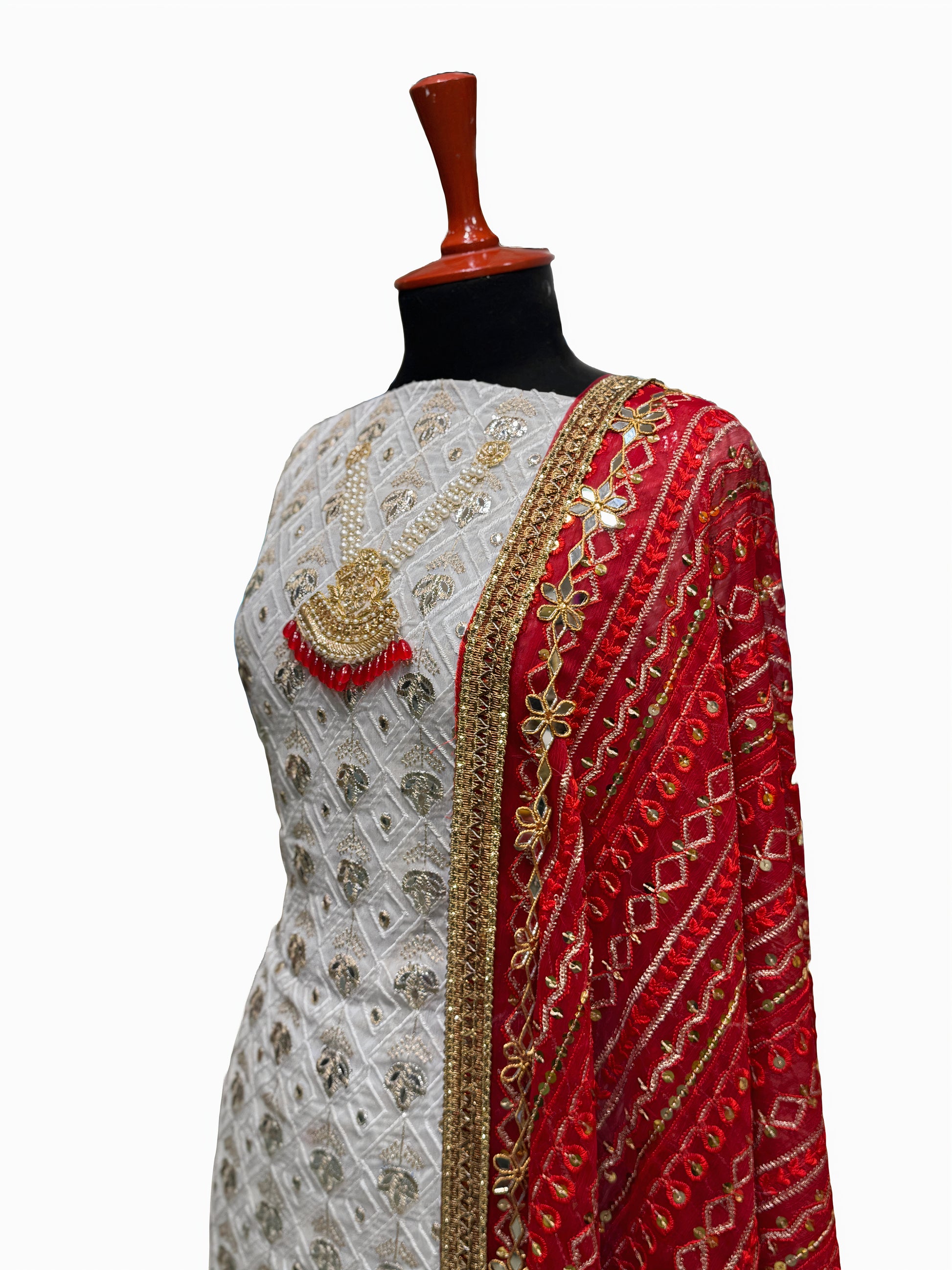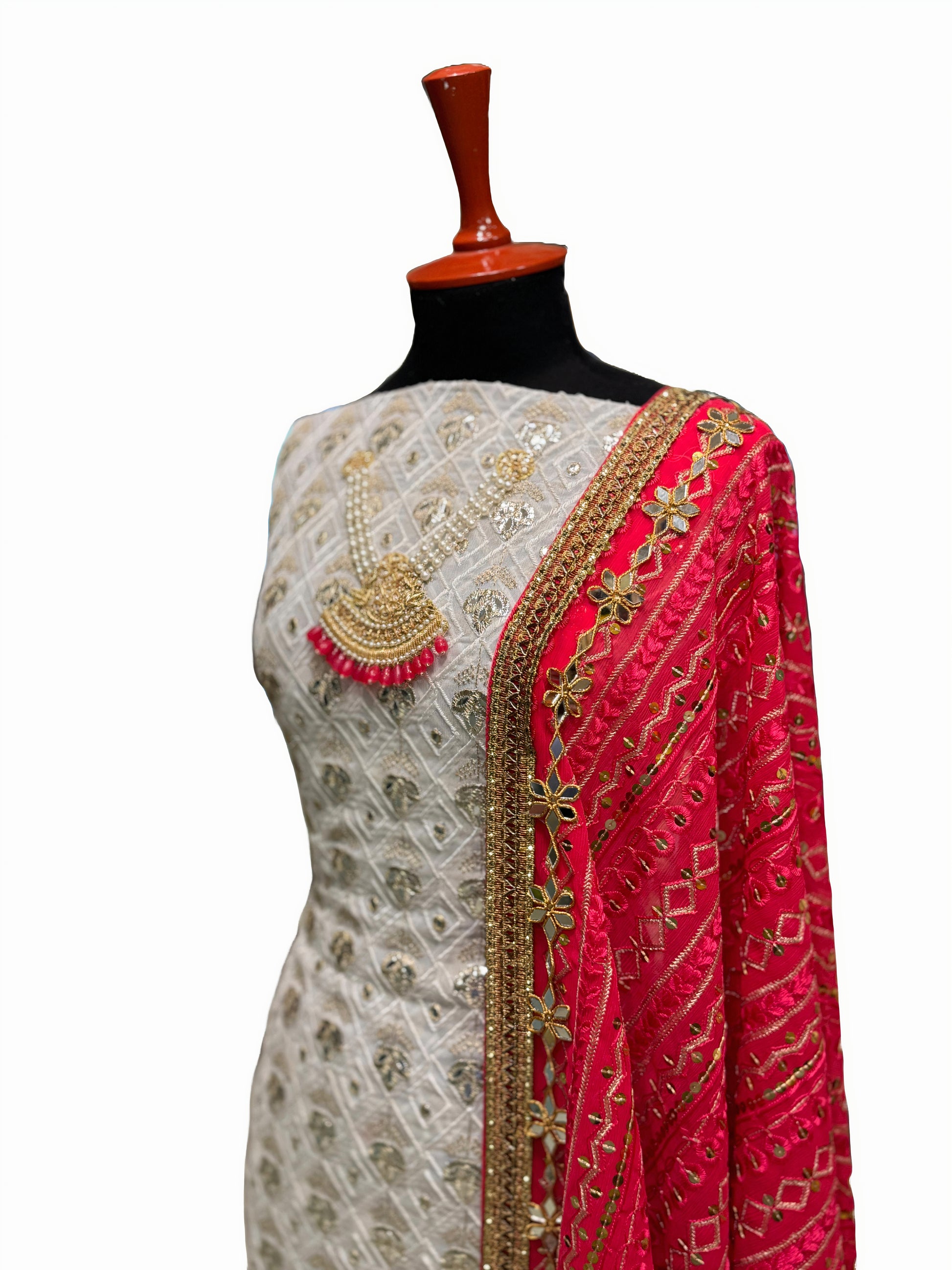 Scarf (Dupatta): 99 inches (2.75 yards) chiffon with sequin work and traditional ribbon lace (gota lace) border