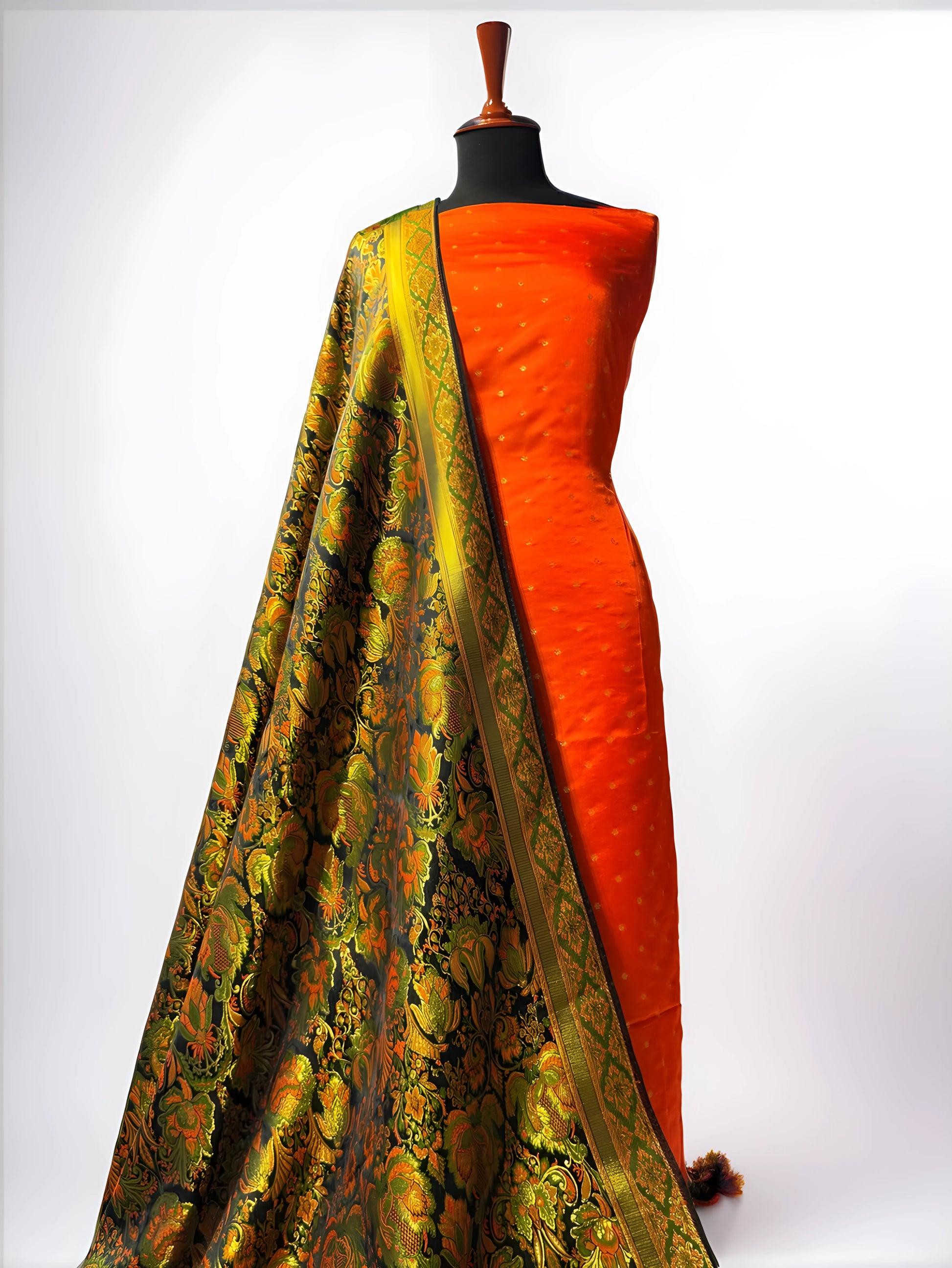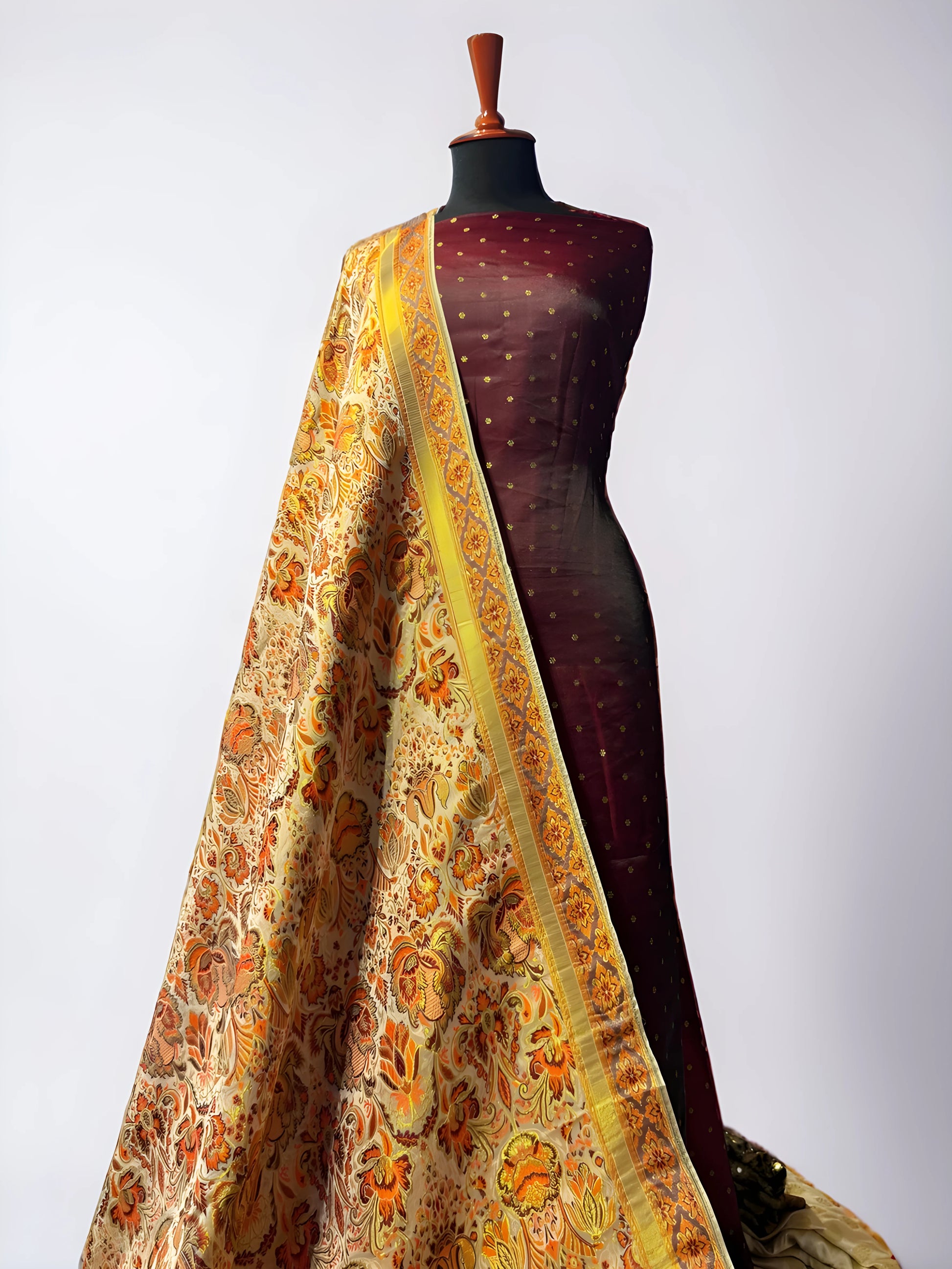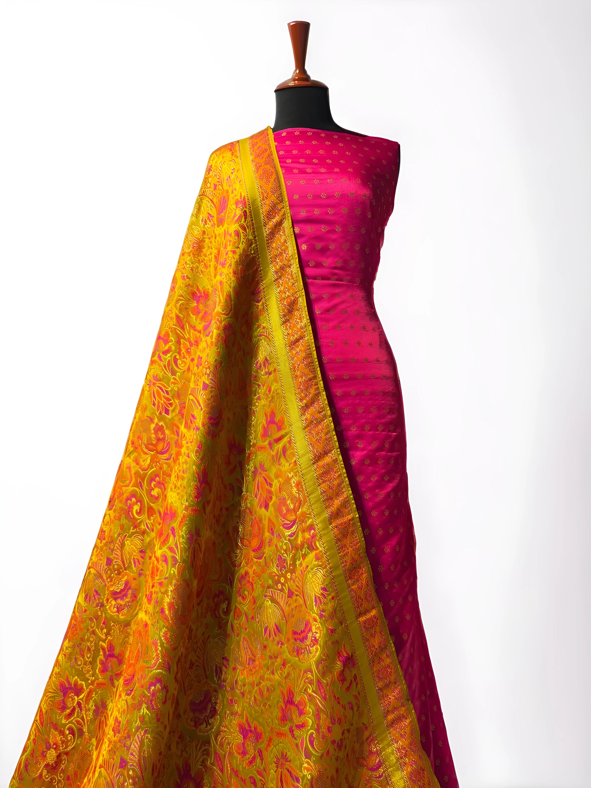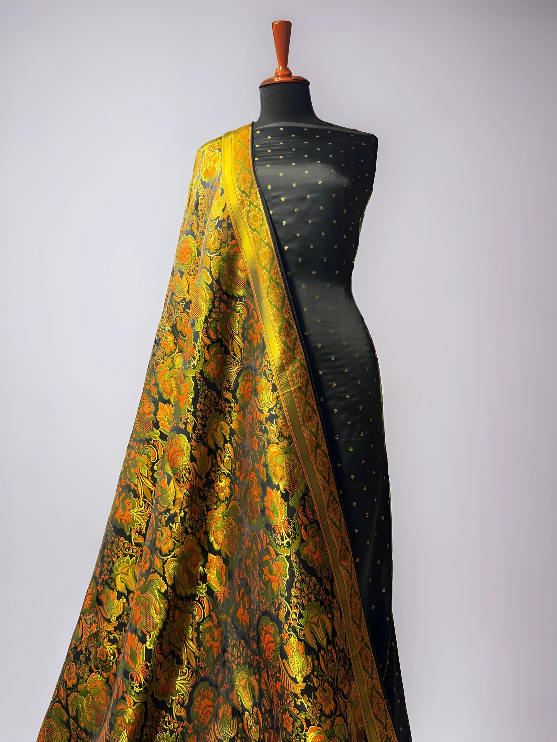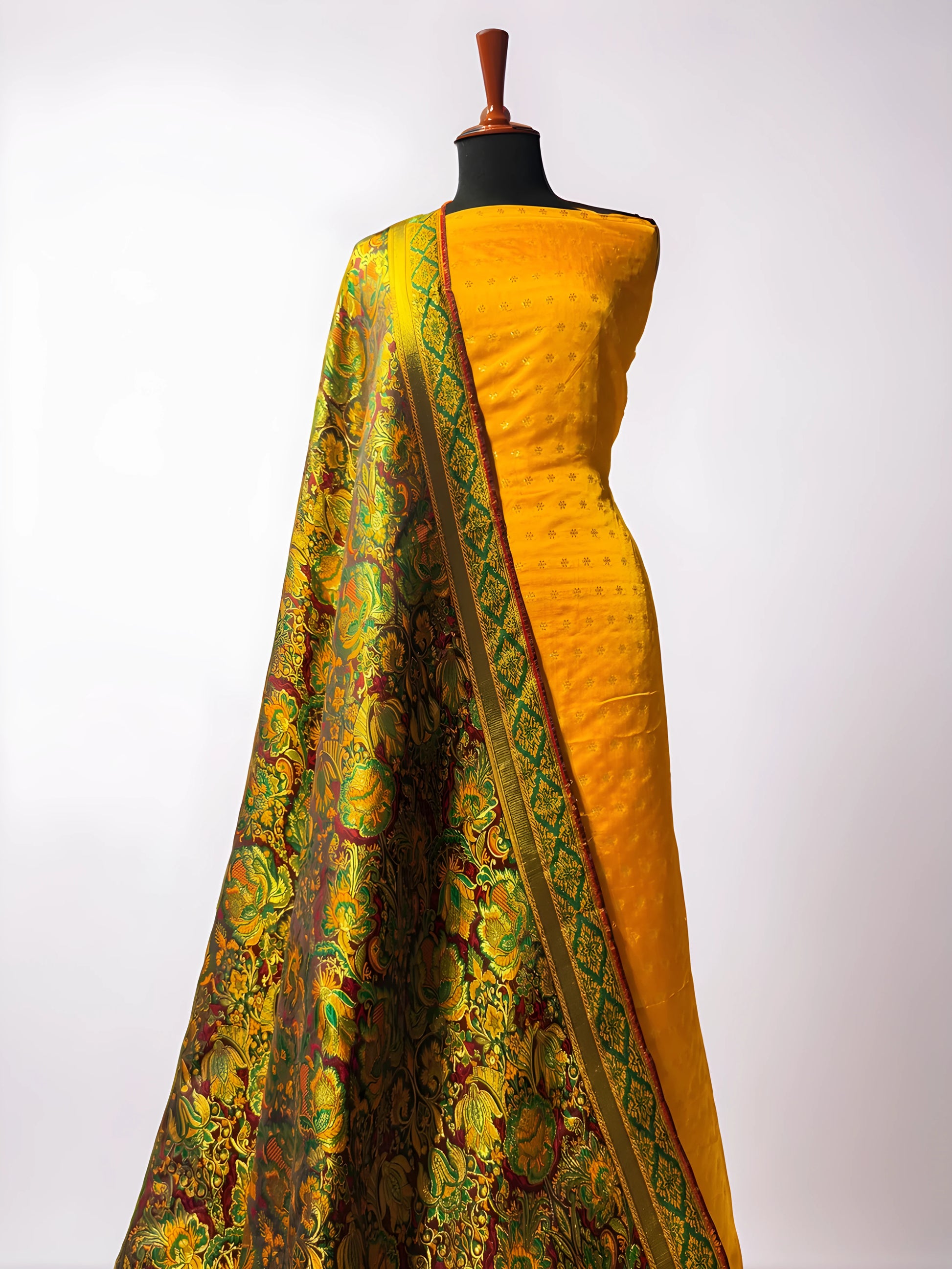 Elevate your style with the Golden Bloom Luxe Set. This elegant outfit includes a luxurious scarf measuring 108 inches (3 yards) and a matching suit fabric of 198 inches (5.5 yards). The scarf features detailed floral designs with a traditional touch, making it perfect for both casual and formal wear. The fabric is premium Banarasi silk that brings a graceful and timeless look for festive occasions, weddings, or special gatherings.