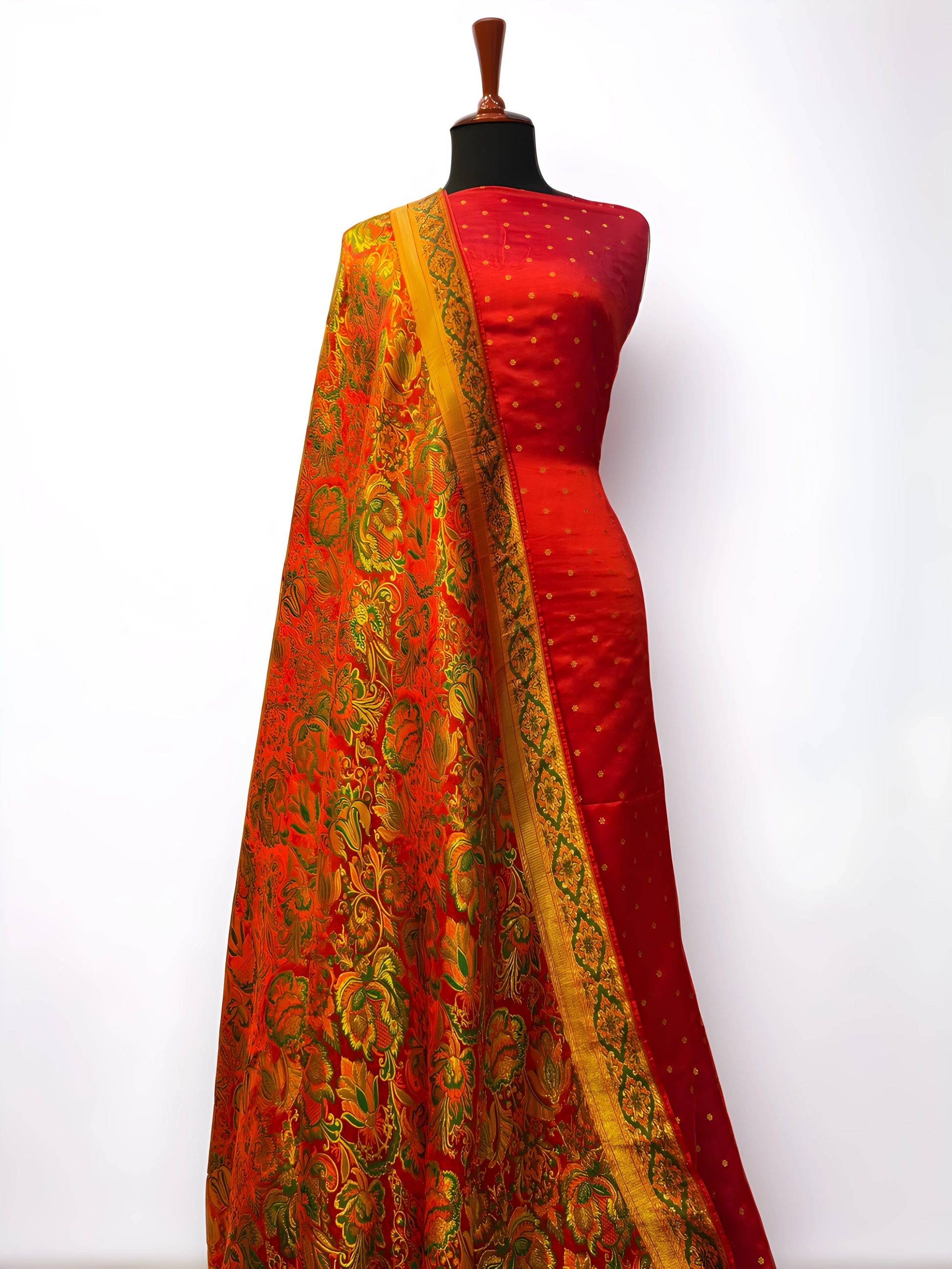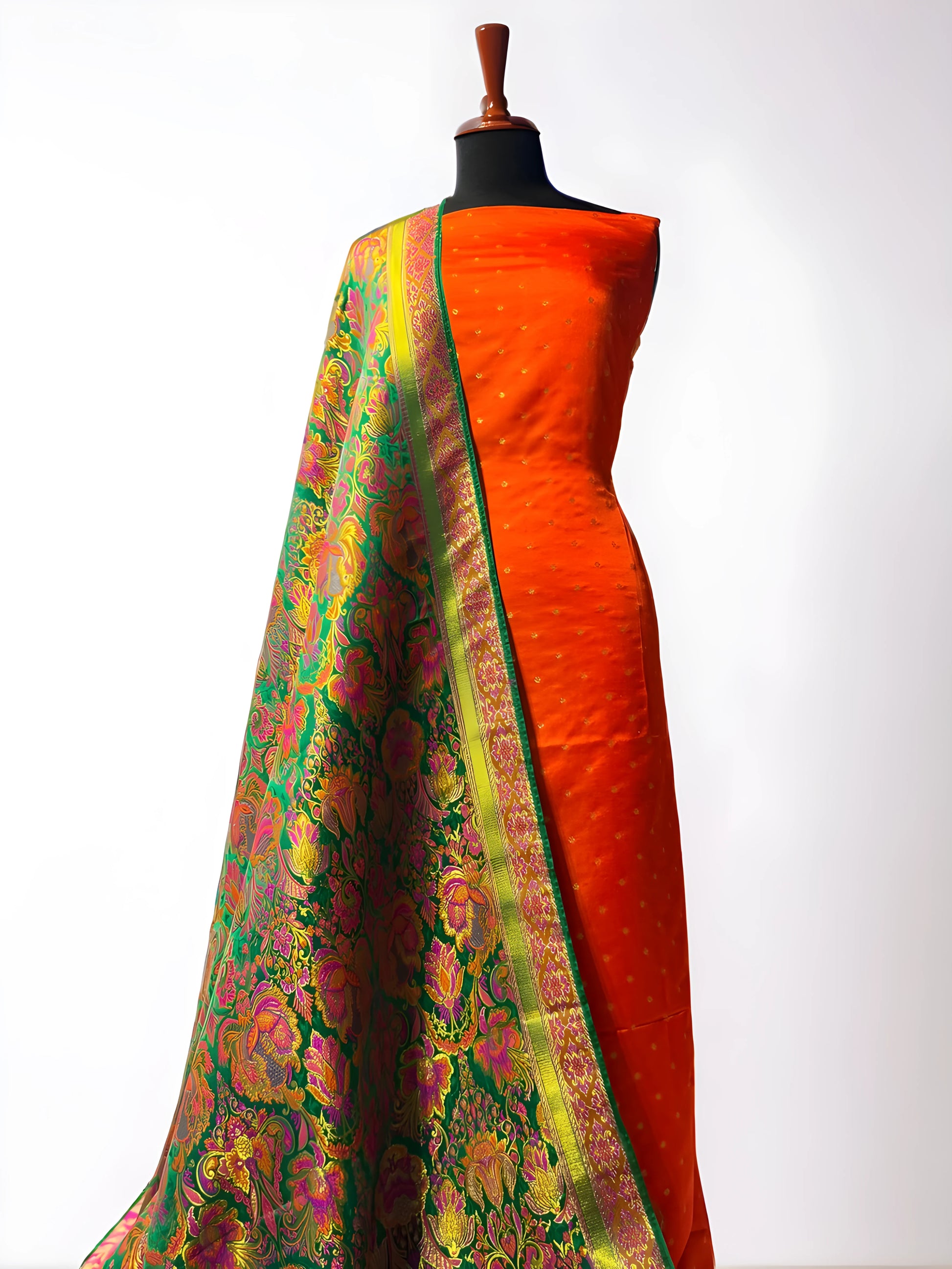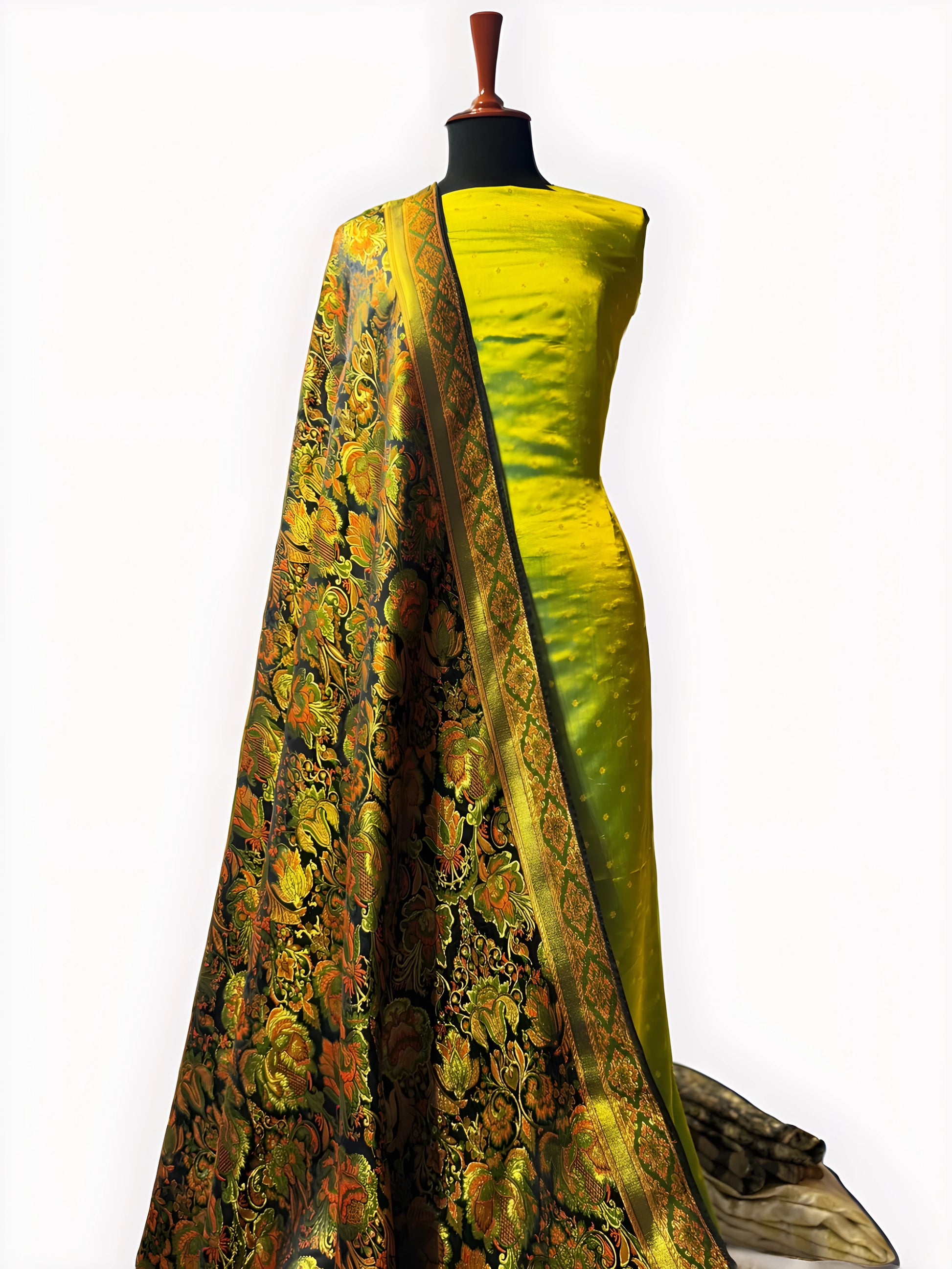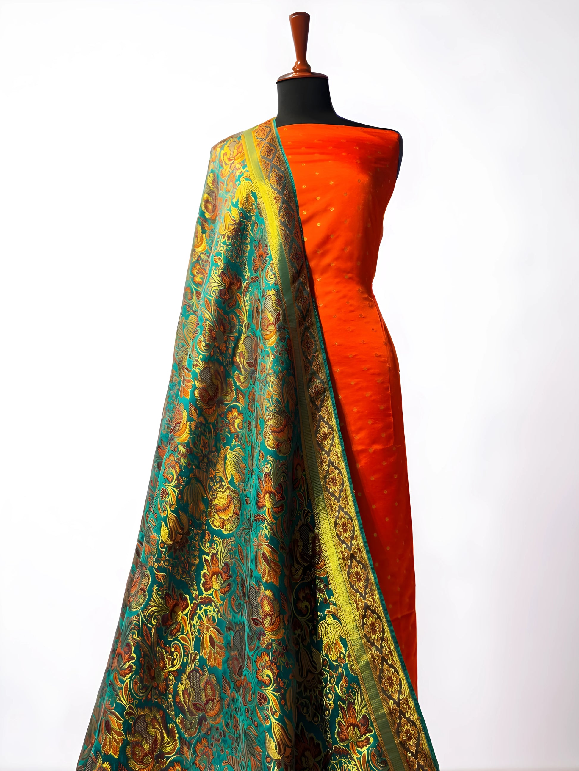 Elevate your style with the Golden Bloom Luxe Set. This elegant outfit includes a luxurious scarf measuring 108 inches (3 yards) and a matching suit fabric of 198 inches (5.5 yards). The scarf features detailed floral designs with a traditional touch, making it perfect for both casual and formal wear. The fabric is premium Banarasi silk that brings a graceful and timeless look for festive occasions, weddings, or special gatherings.