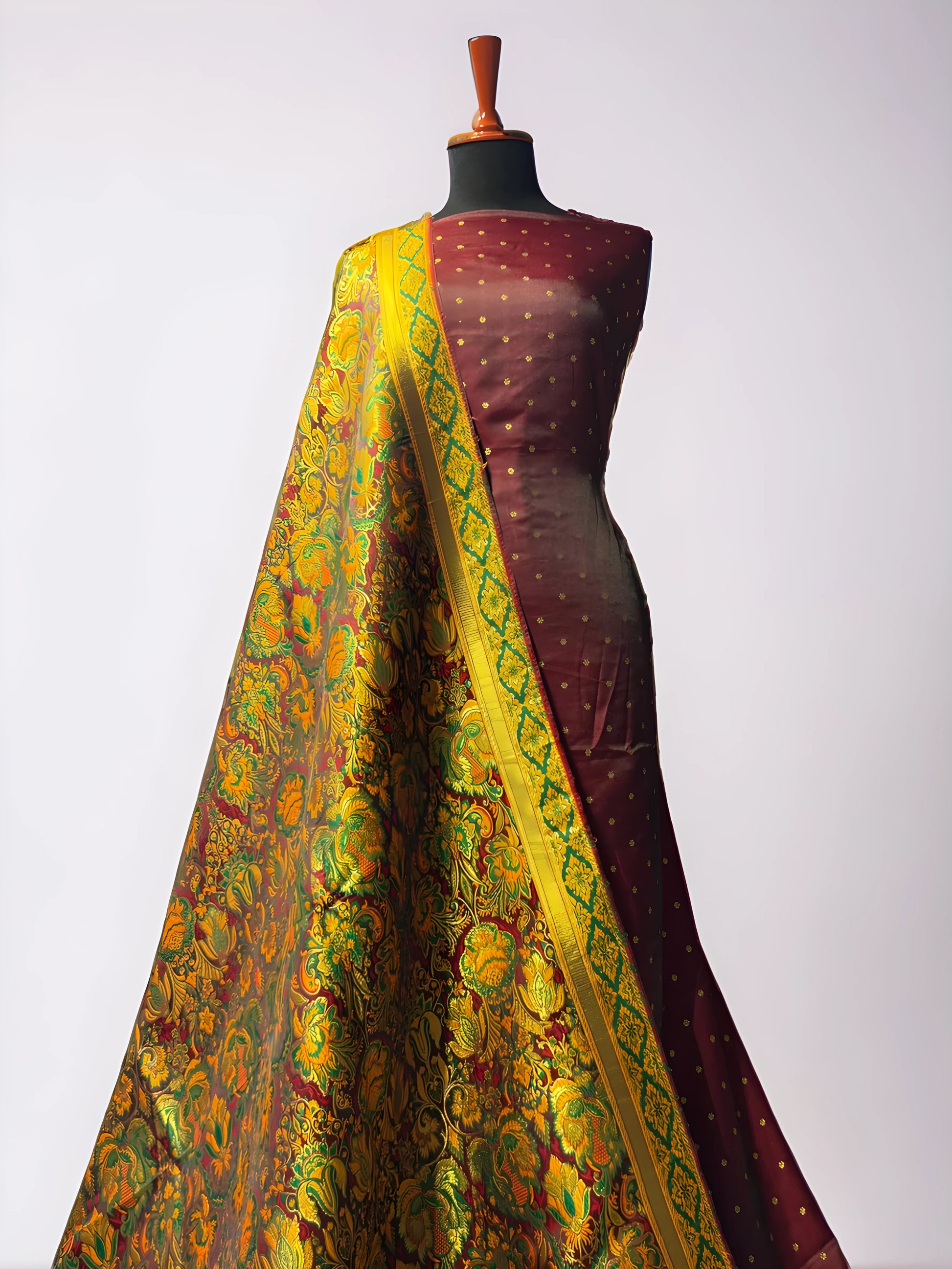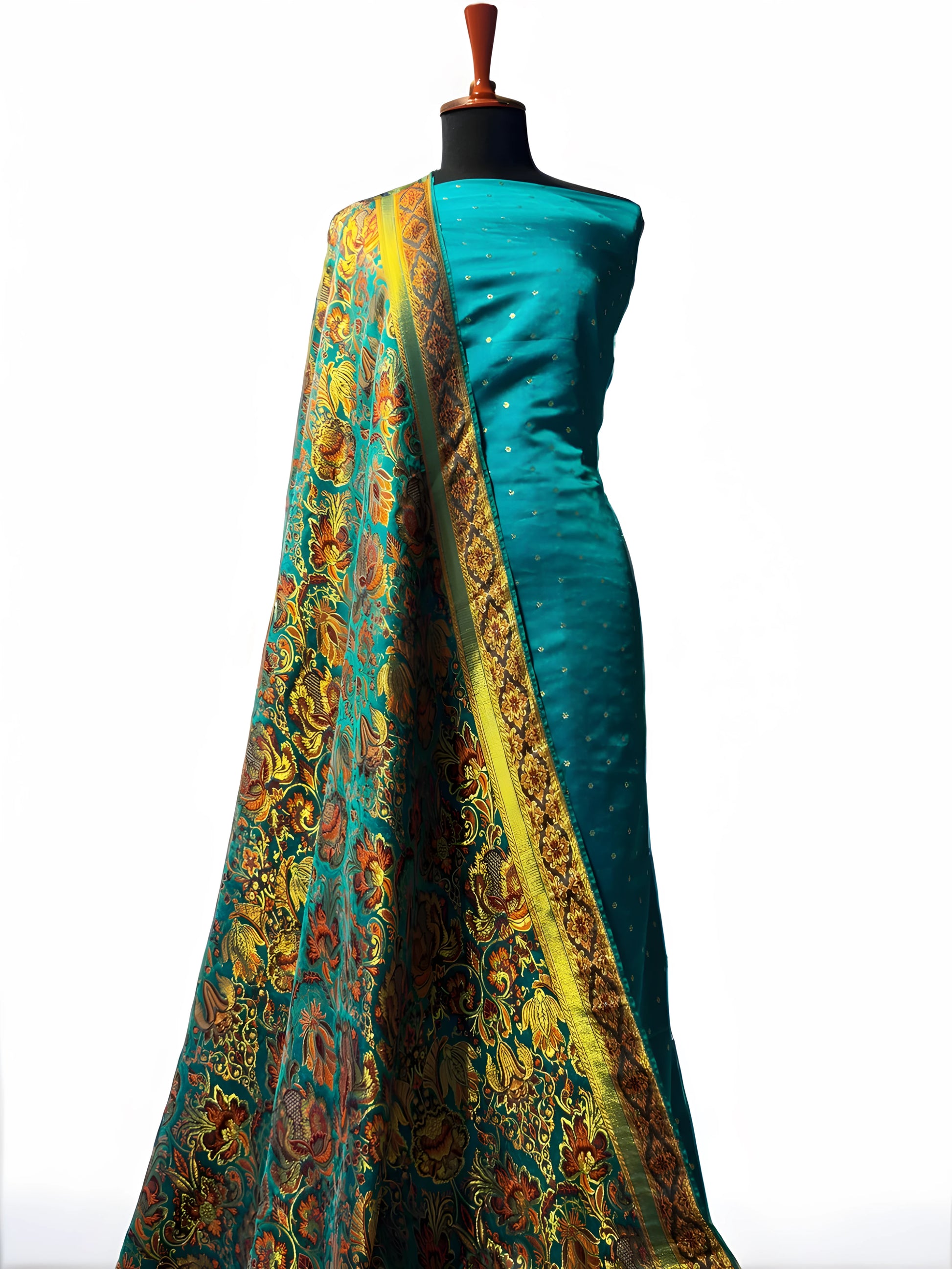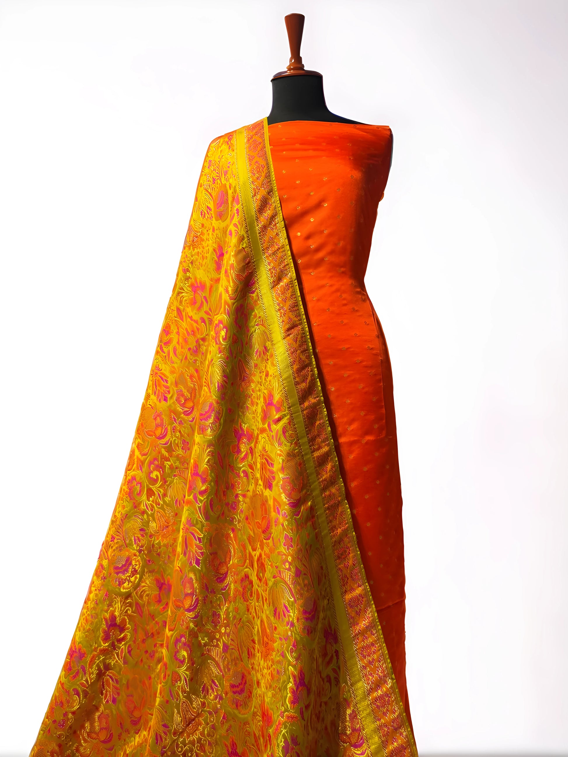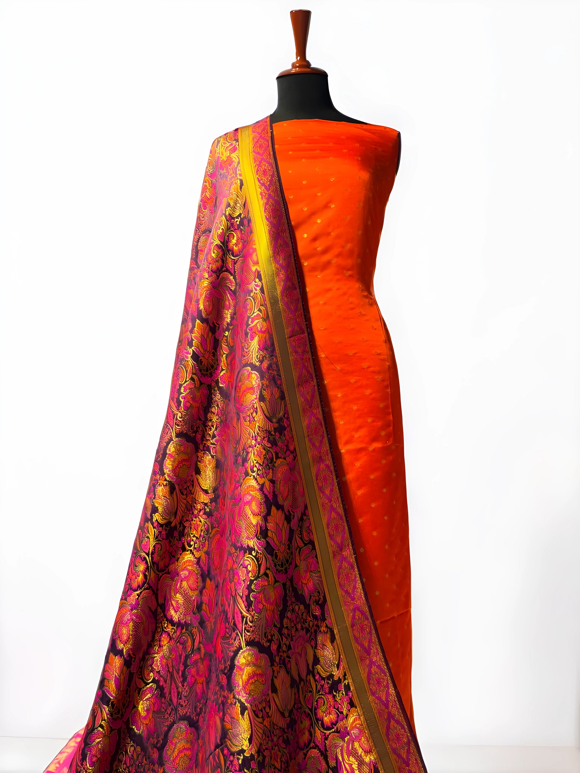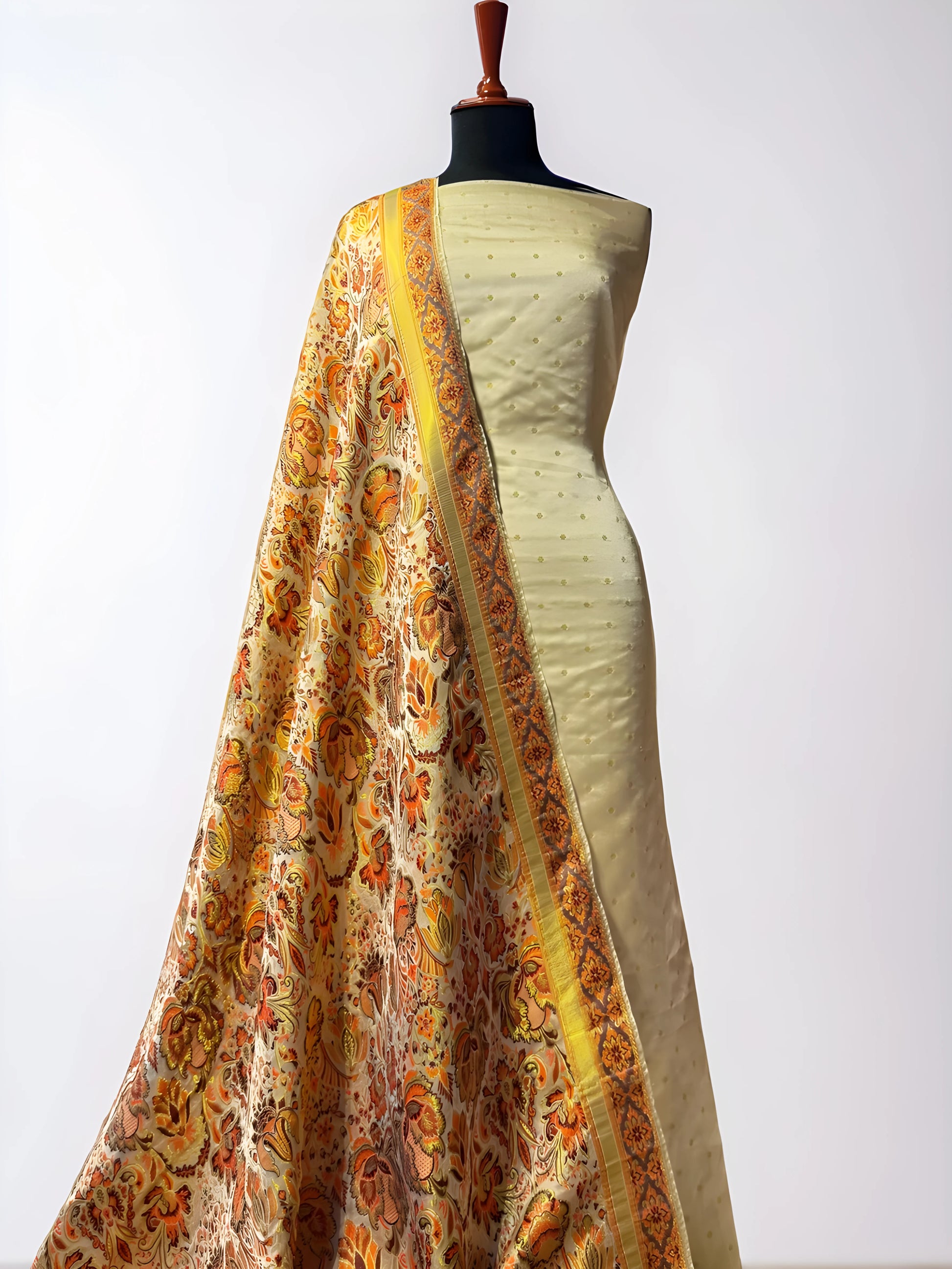Elevate your style with the Golden Bloom Luxe Set. This elegant outfit includes a luxurious scarf measuring 108 inches (3 yards) and a matching suit fabric of 198 inches (5.5 yards). The scarf features detailed floral designs with a traditional touch, making it perfect for both casual and formal wear. The fabric is premium Banarasi silk that brings a graceful and timeless look for festive occasions, weddings, or special gatherings.
