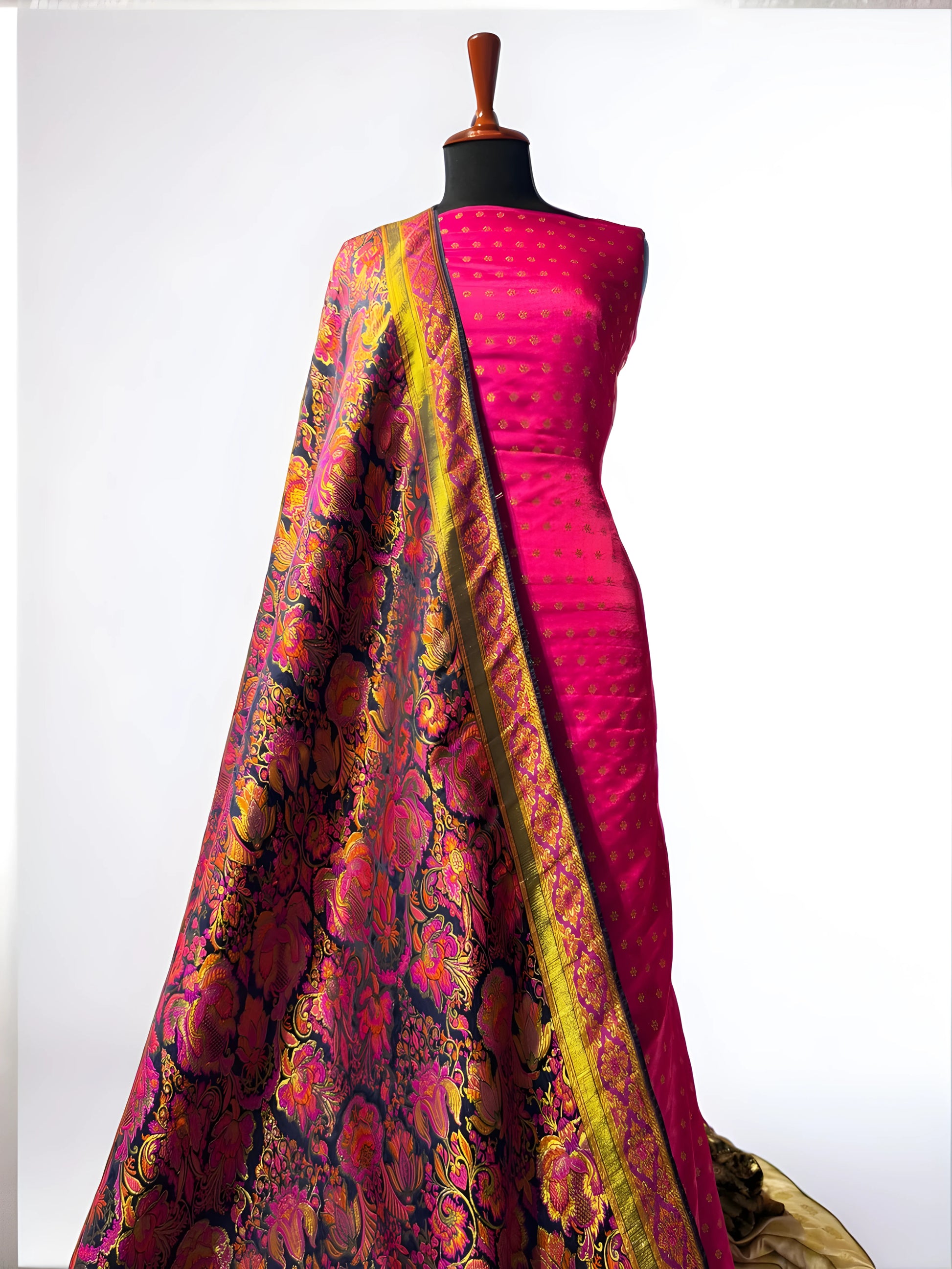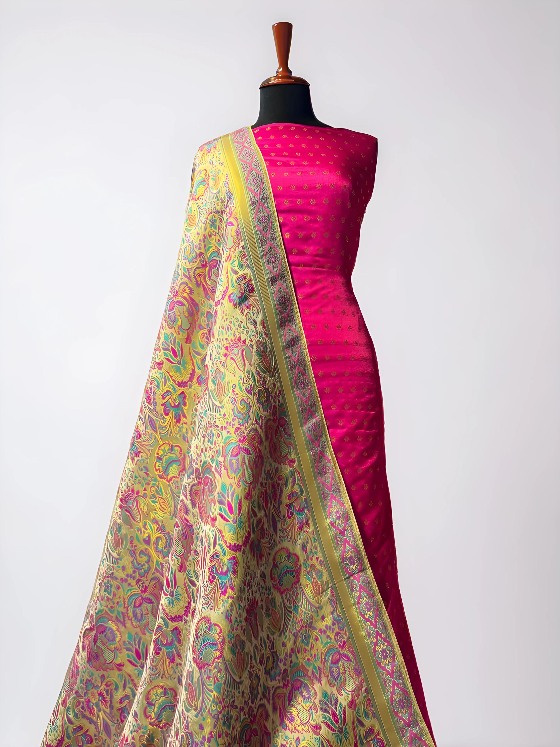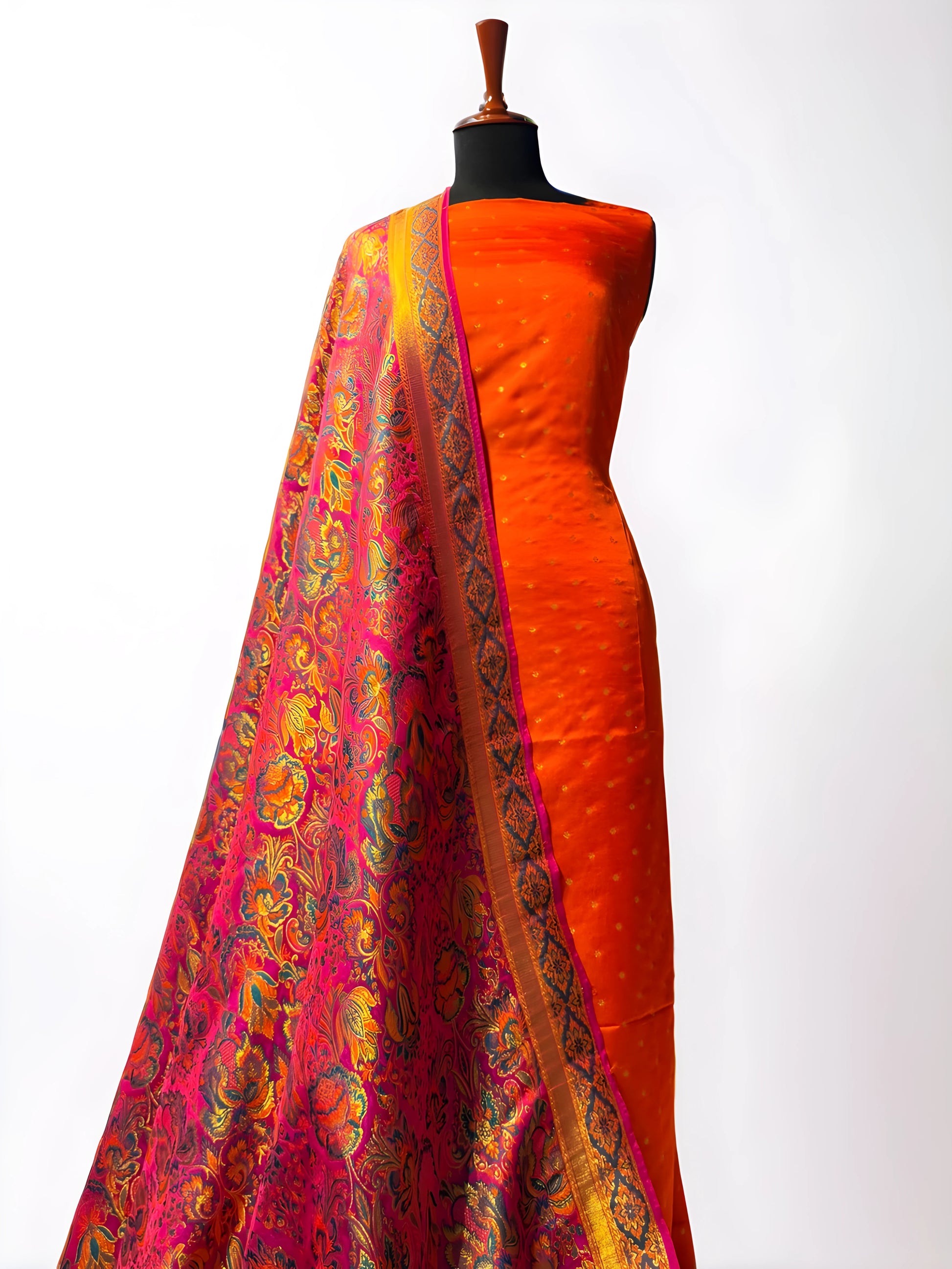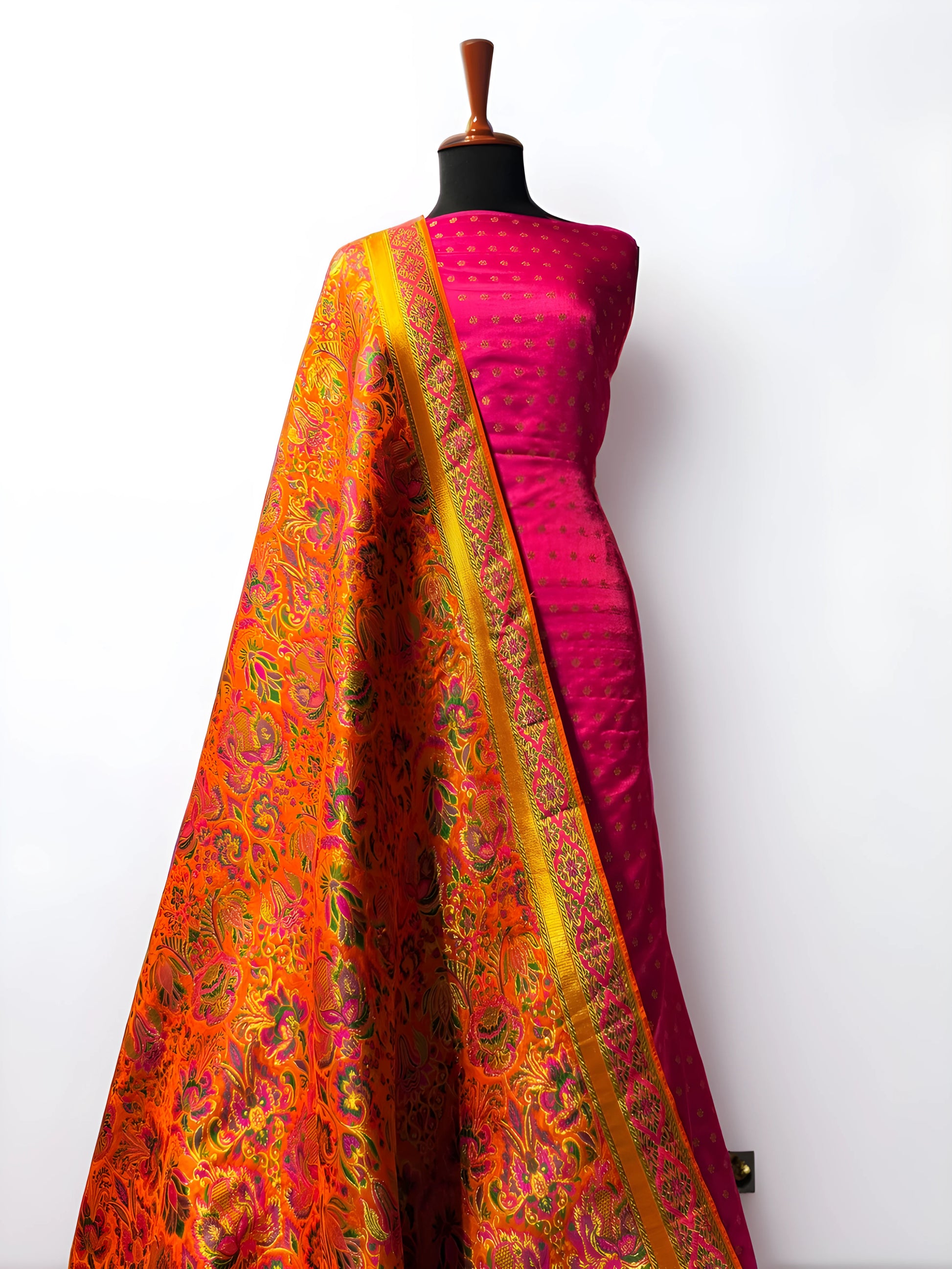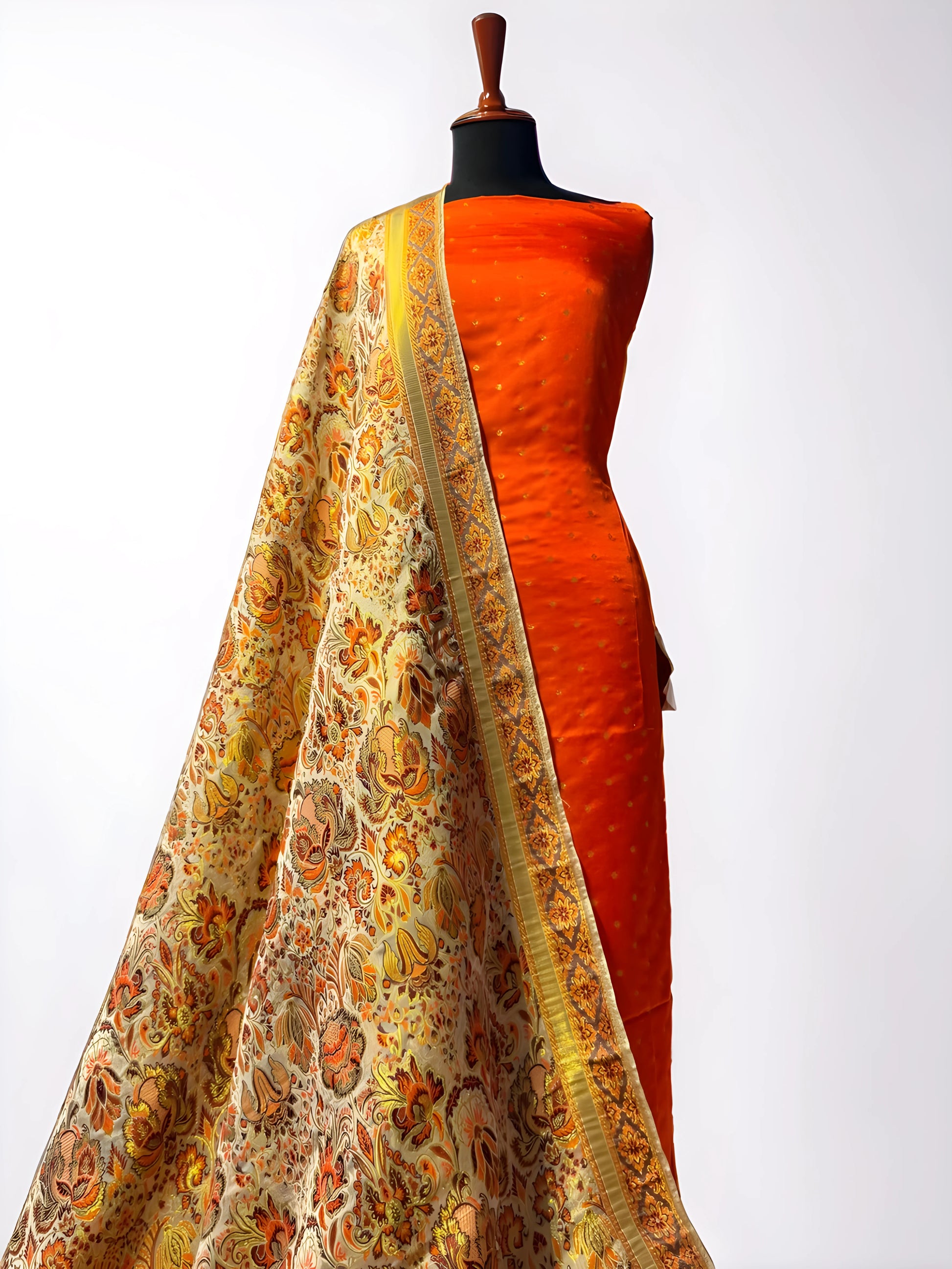 Elevate your style with the Golden Bloom Luxe Set. This elegant outfit includes a luxurious scarf measuring 108 inches (3 yards) and a matching suit fabric of 198 inches (5.5 yards). The scarf features detailed floral designs with a traditional touch, making it perfect for both casual and formal wear. The fabric is premium Banarasi silk that brings a graceful and timeless look for festive occasions, weddings, or special gatherings.