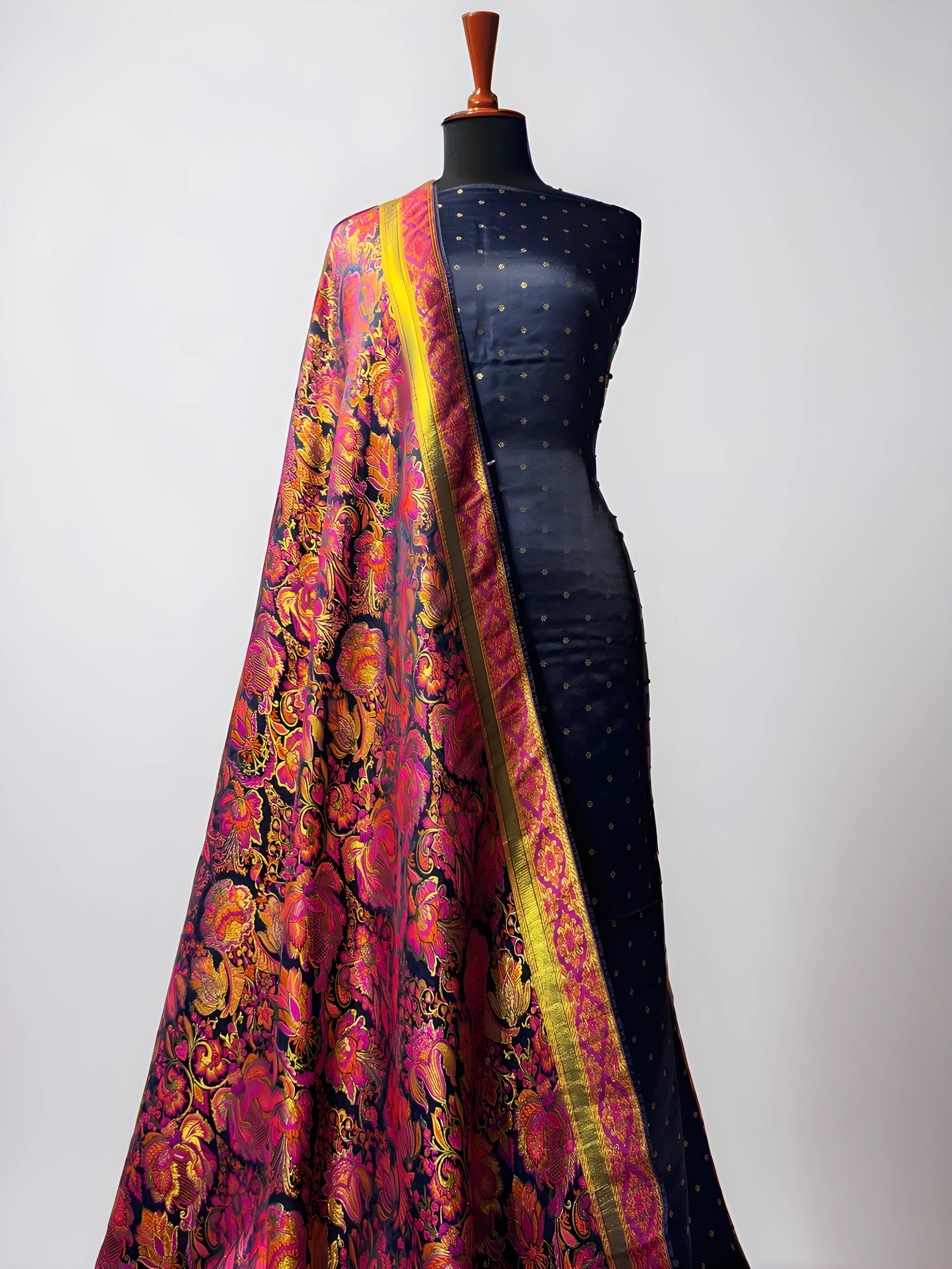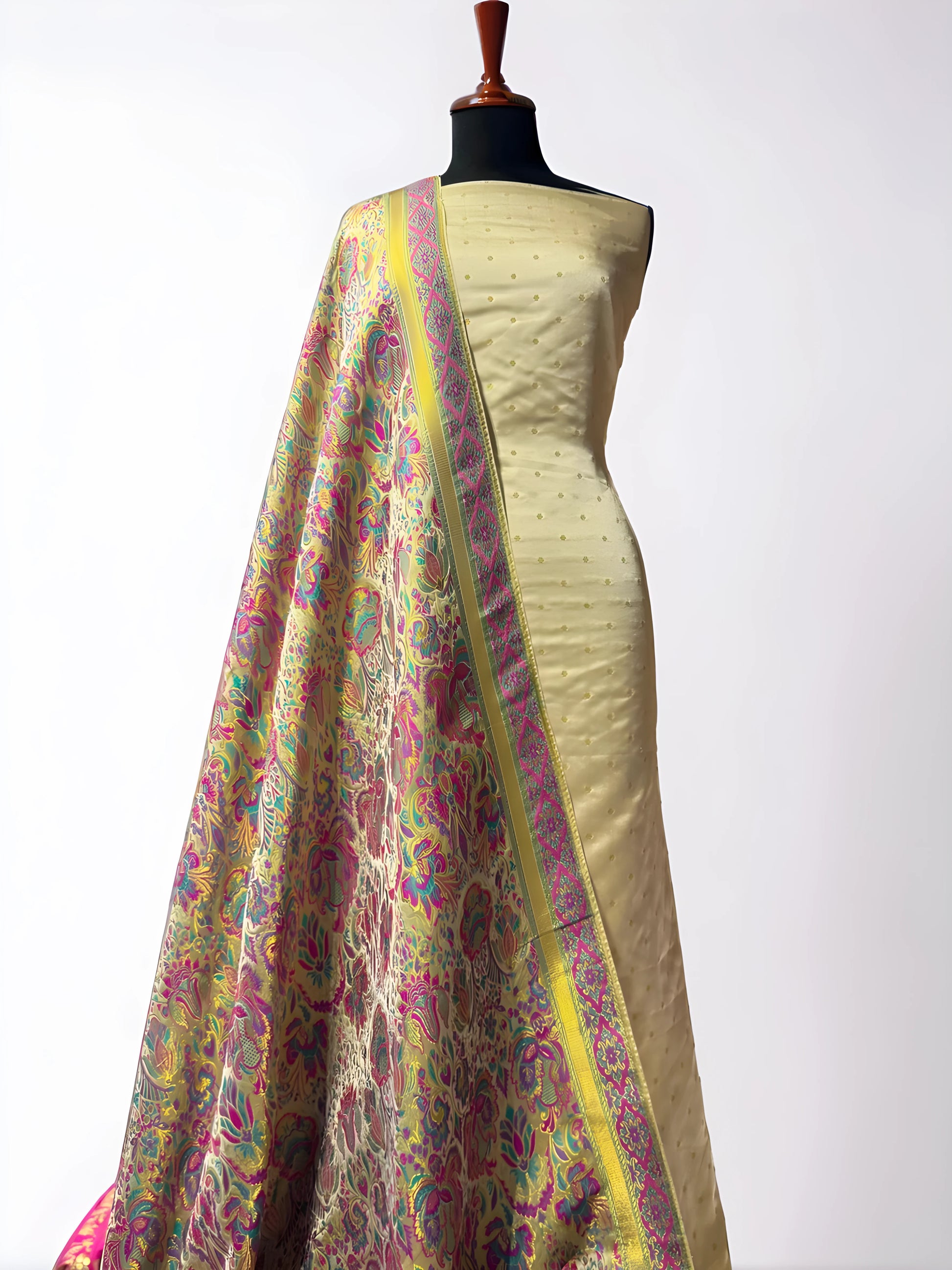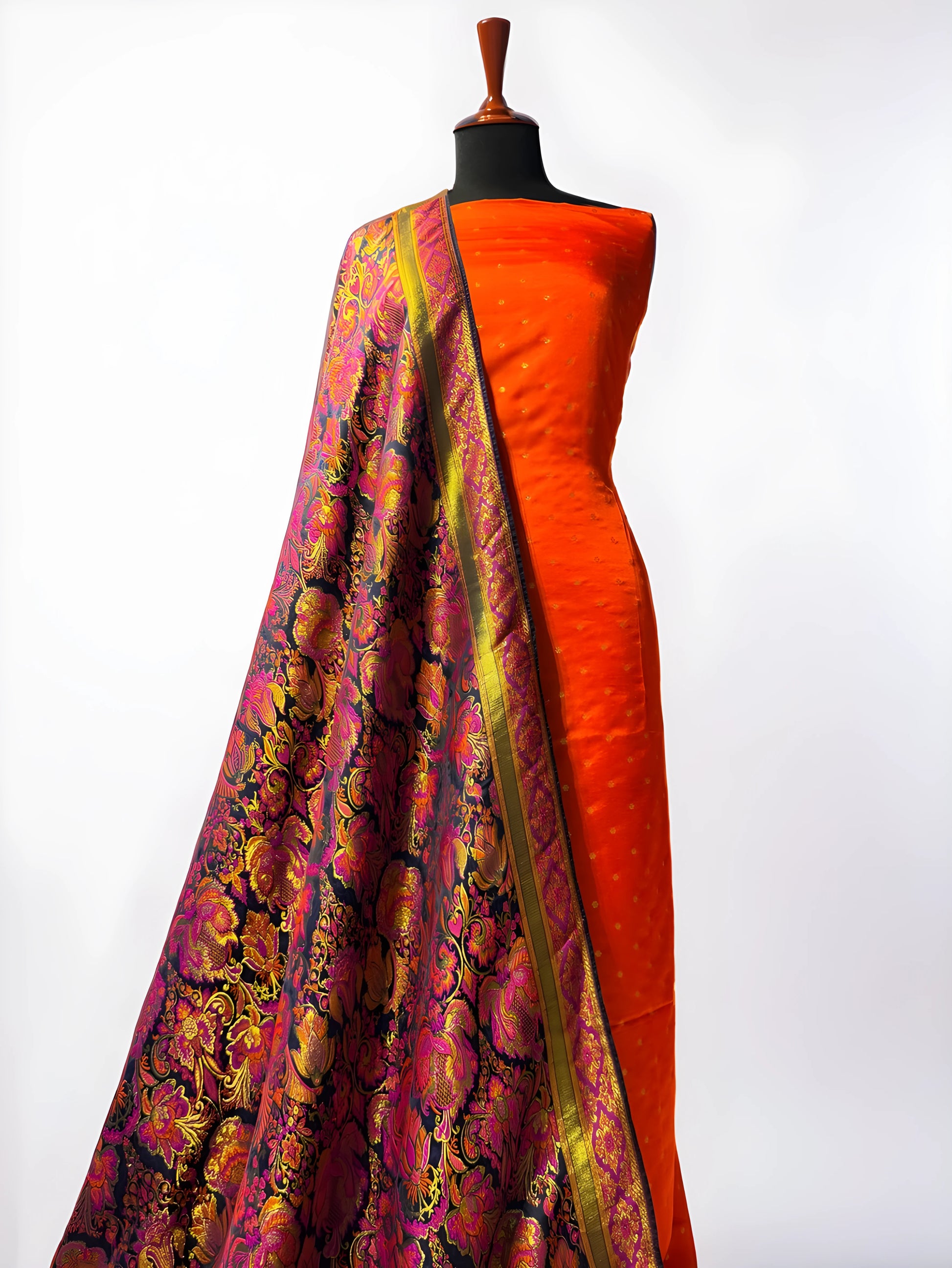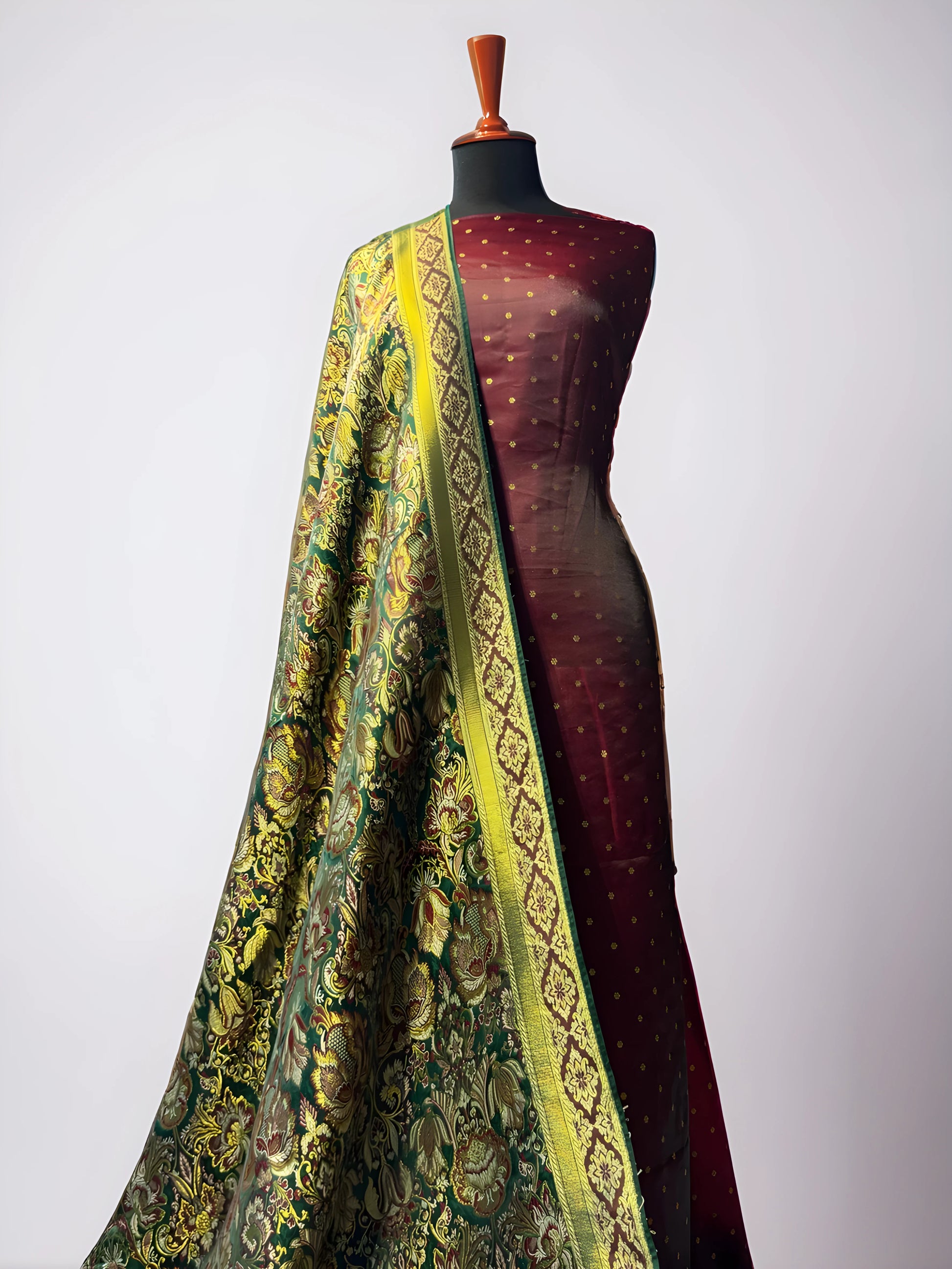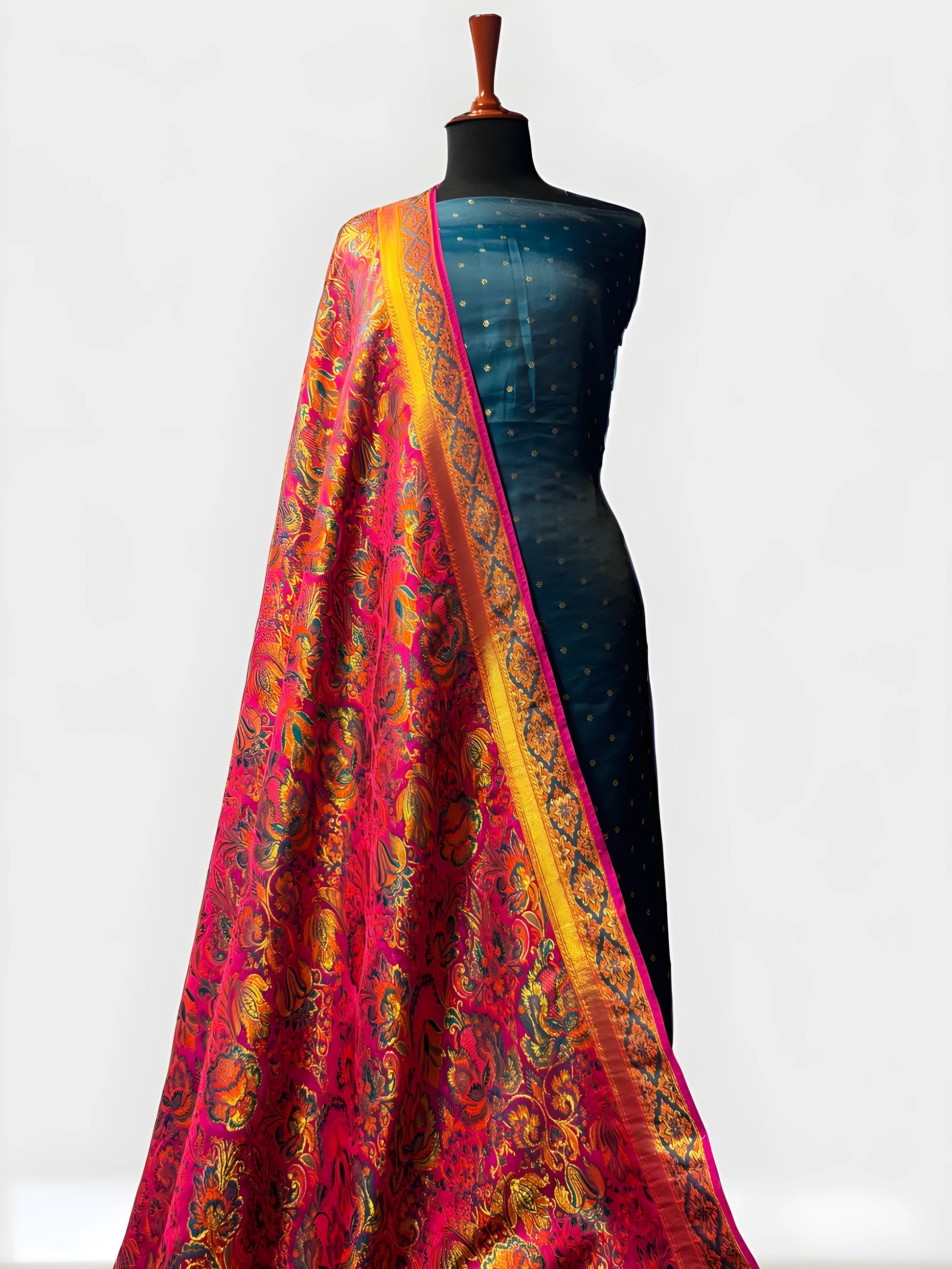 Elevate your style with the Golden Bloom Luxe Set. This elegant outfit includes a luxurious scarf measuring 108 inches (3 yards) and a matching suit fabric of 198 inches (5.5 yards). The scarf features detailed floral designs with a traditional touch, making it perfect for both casual and formal wear. The fabric is premium Banarasi silk that brings a graceful and timeless look for festive occasions, weddings, or special gatherings.