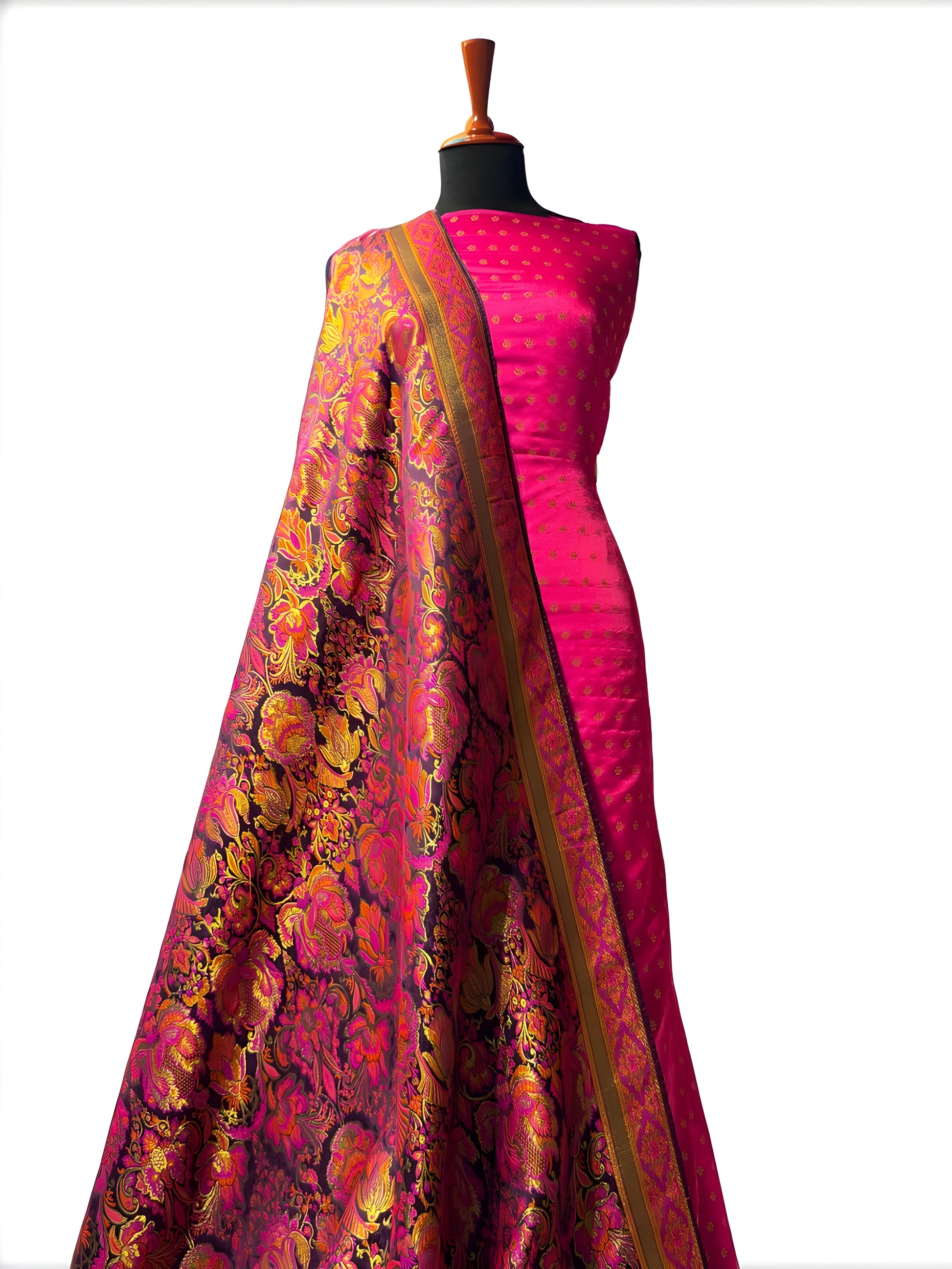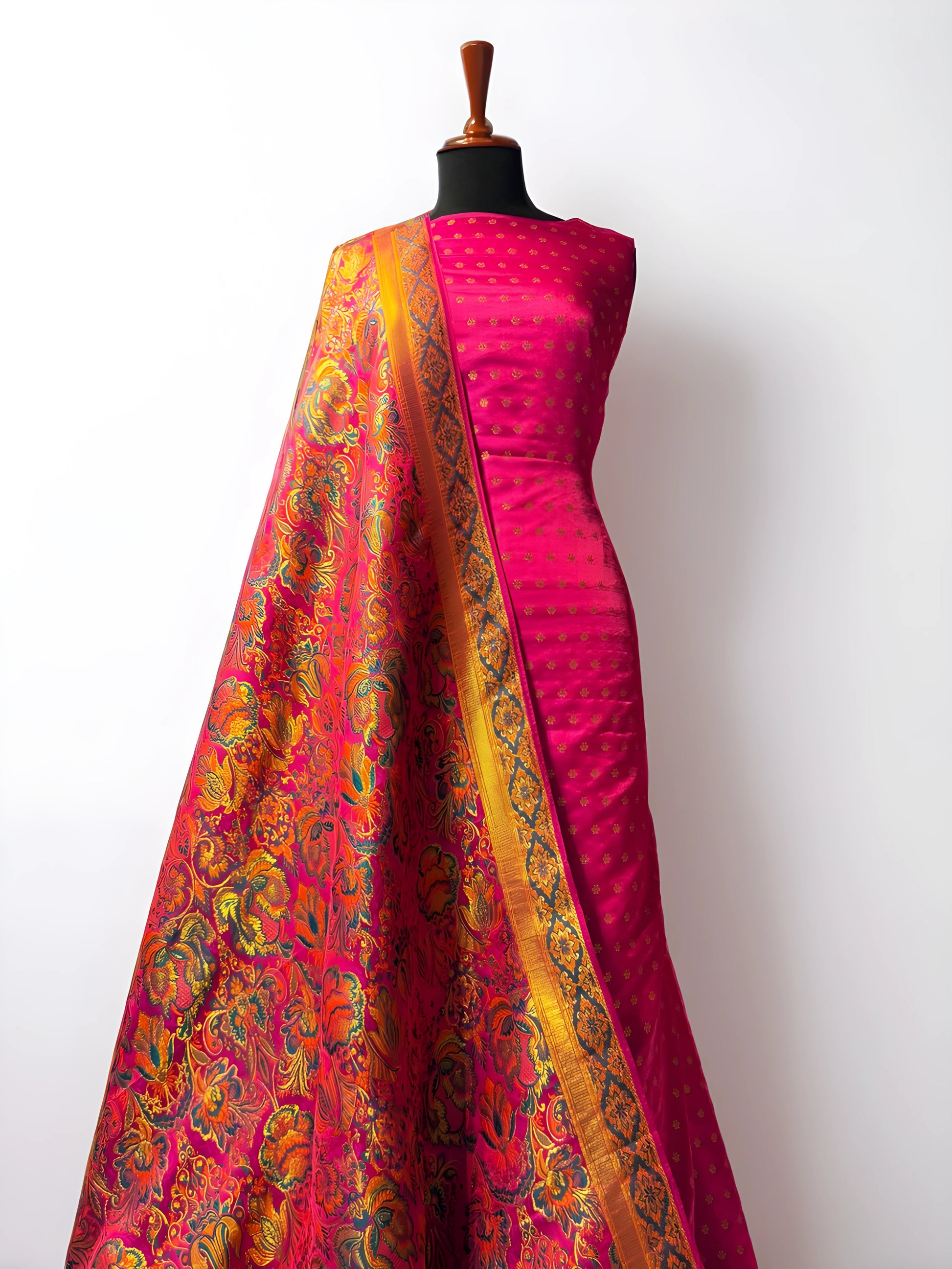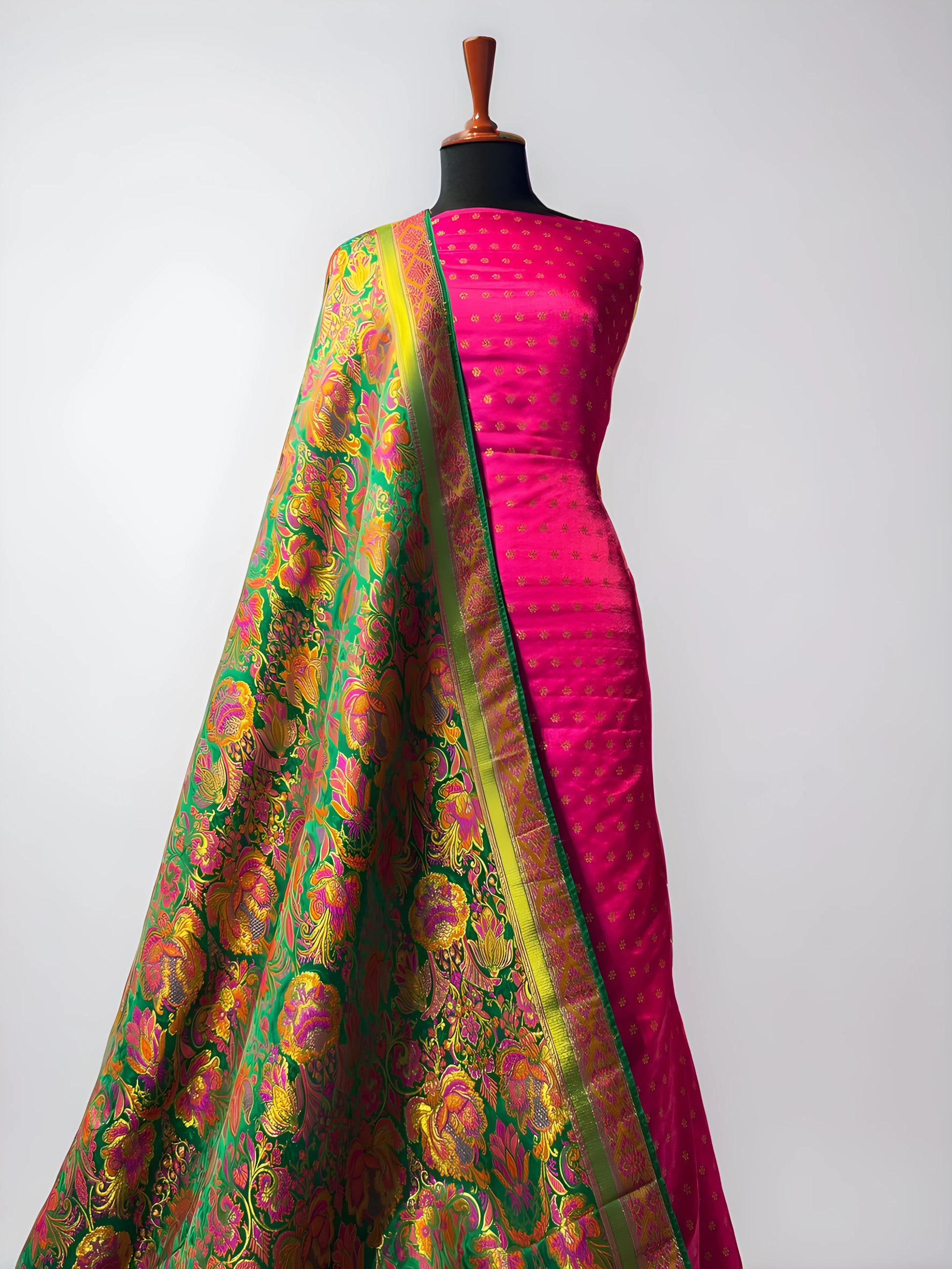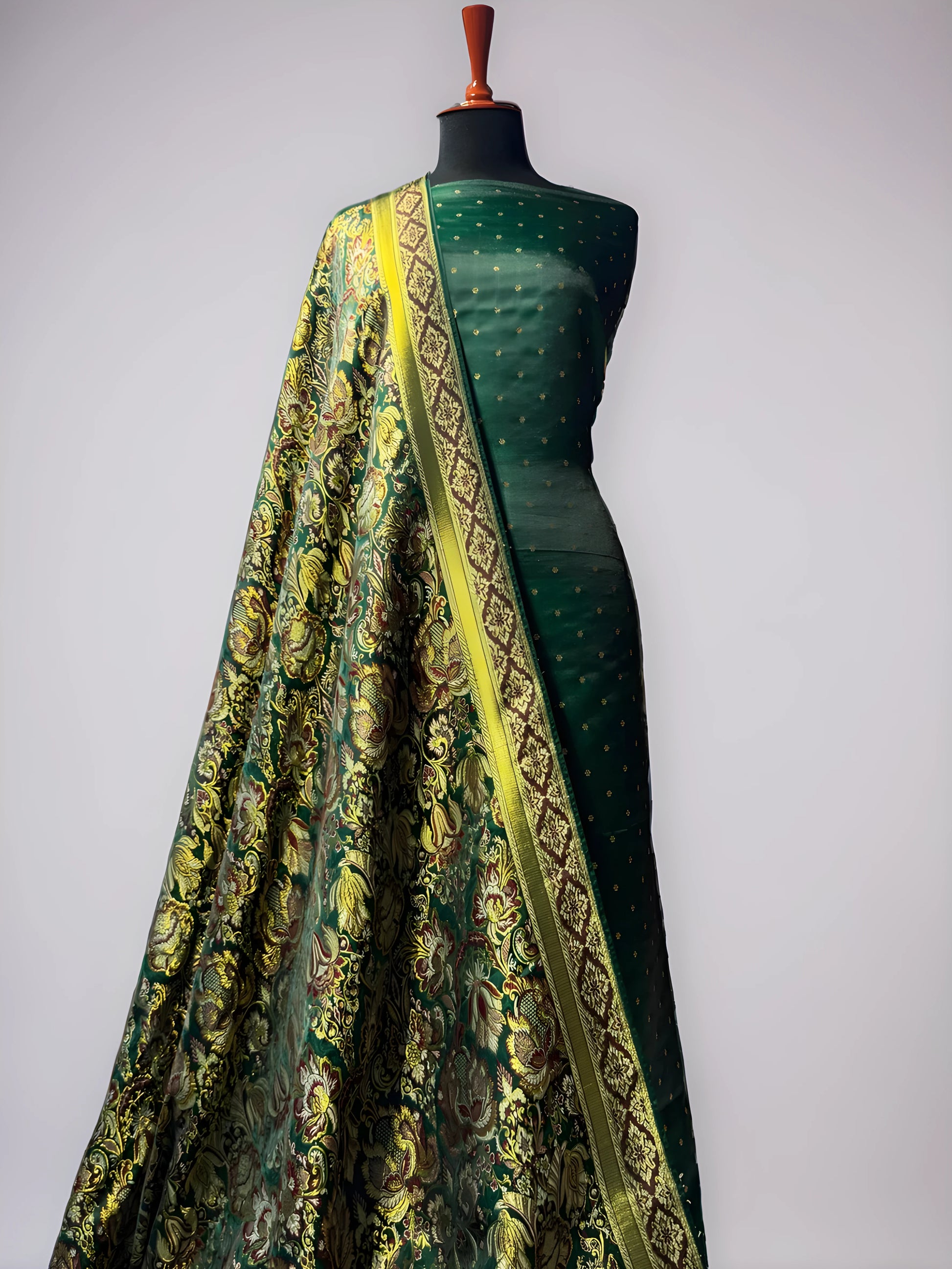 Elevate your style with the Golden Bloom Luxe Set. This elegant outfit includes a luxurious scarf measuring 108 inches (3 yards) and a matching suit fabric of 198 inches (5.5 yards). The scarf features detailed floral designs with a traditional touch, making it perfect for both casual and formal wear. The fabric is premium Banarasi silk that brings a graceful and timeless look for festive occasions, weddings, or special gatherings.