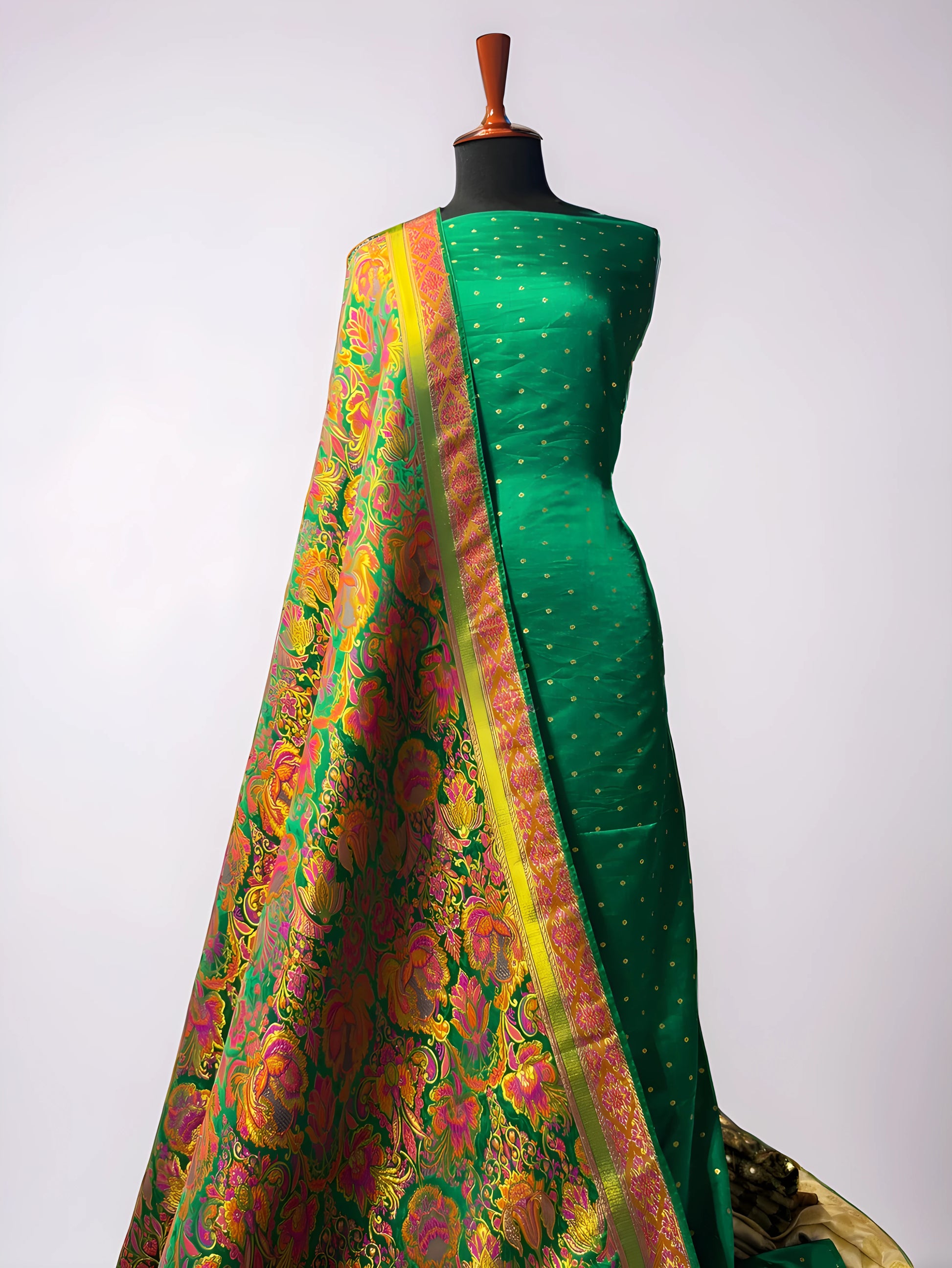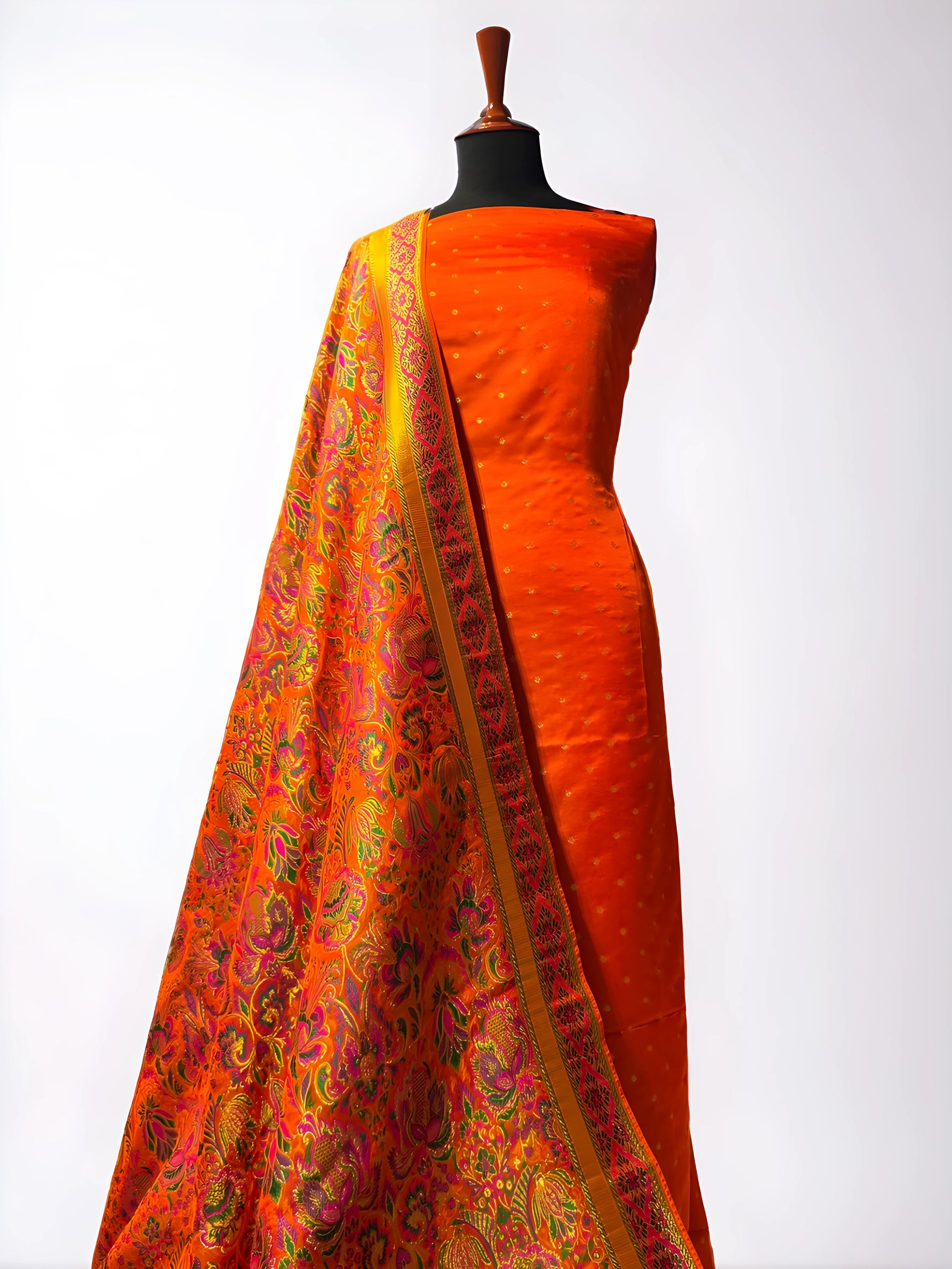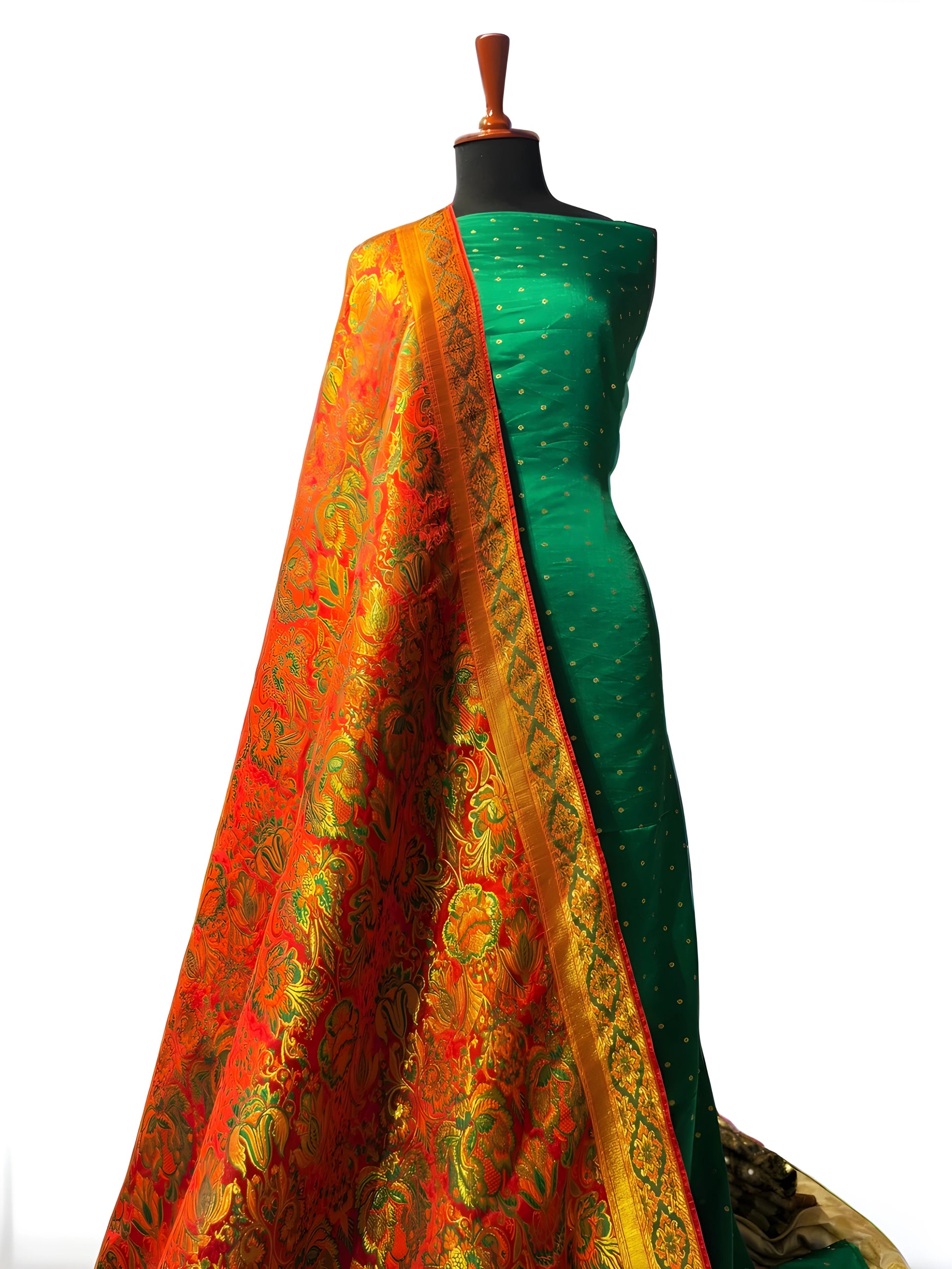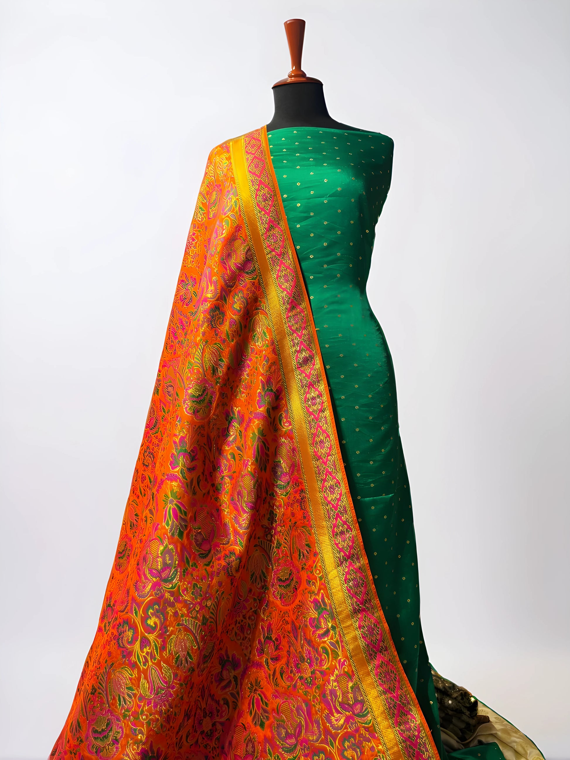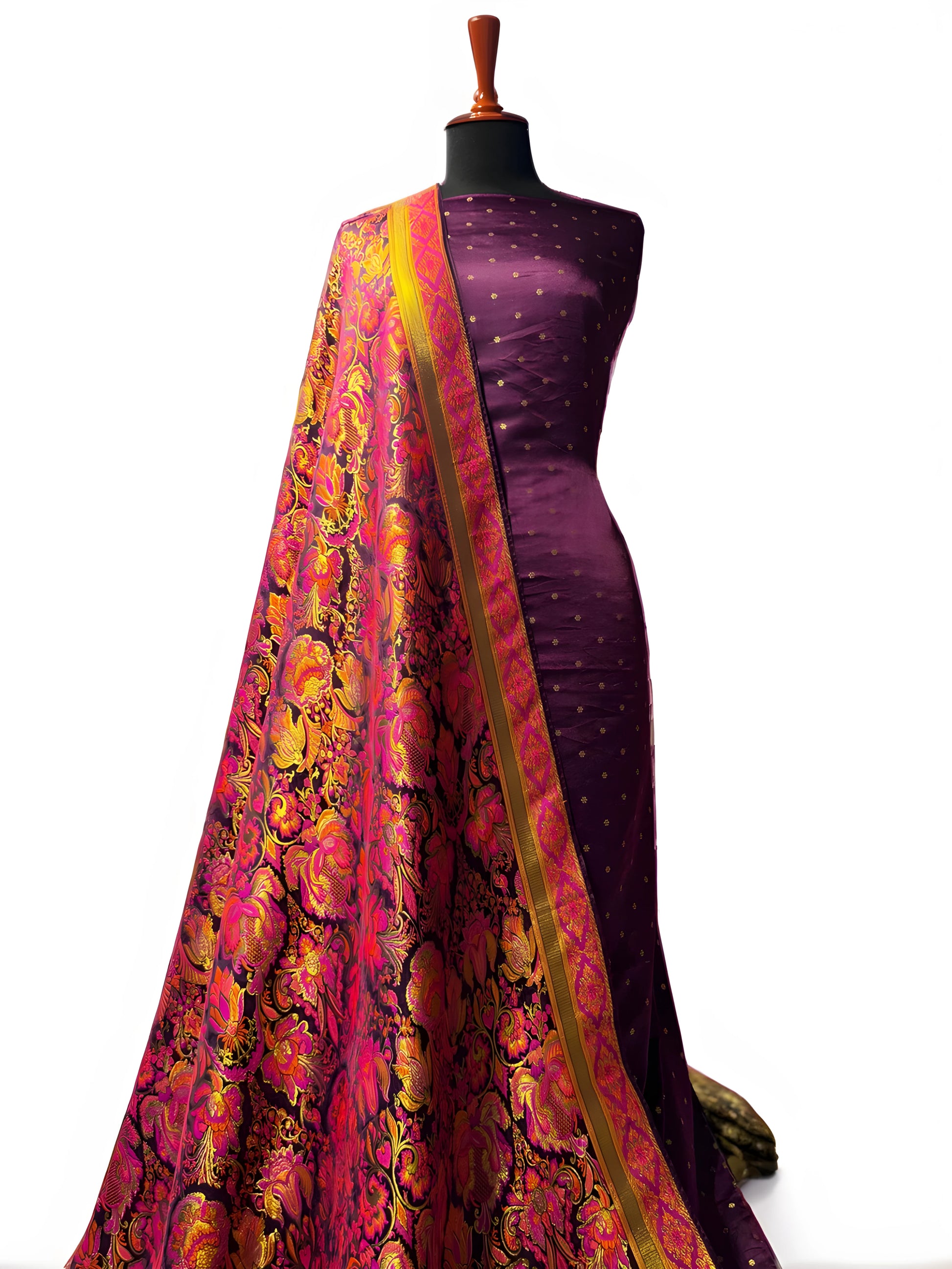 Elevate your style with the Golden Bloom Luxe Set. This elegant outfit includes a luxurious scarf measuring 108 inches (3 yards) and a matching suit fabric of 198 inches (5.5 yards). The scarf features detailed floral designs with a traditional touch, making it perfect for both casual and formal wear. The fabric is premium Banarasi silk that brings a graceful and timeless look for festive occasions, weddings, or special gatherings.